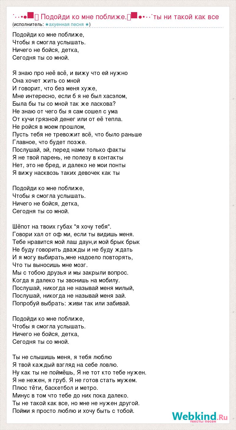 Подойди ко мне поближе, Чтобы я смогла услышать. Ничего не бойся, детка, Сегодня ты со мной. Я знаю про неё всё, и вижу что ей нужно Она хочет жить со мной И говорит, что без меня хуже, Мне интересно, если б я не был хасэлом, Была бы ты со мной так же ласкова? Не знаю от чего бы я сам сошел с ума От кучи грязной денег или от её тепла. Не ройся в моем прошлом, Пусть тебя не тревожит всё, что было раньше Главное, что будет позже. Послушай, эй, перед нами только факты Я не твой парень, не полезу в контакты Нет, это не бред, и далеко не мои понты Я вижу насквозь таких девочек как ты Подойди ко мне поближе, Чтобы я смогла услышать. Ничего не бойся, детка, Сегодня ты со мной. Шёпот на твоих губах "я хочу тебя". Говори хал от оф ми, если ты видишь меня. Тебе нравится мой лаш даун,и мой брык брык Не буду говорить дважды и не буду ждать И я могу выбирать,мне надоело повторять, Что ты выносишь мне мозг. Мы с тобою друзья и мы закрыли вопрос. Когда я далеко ты звонишь на мобилу. Послушай, никогда не называй меня милый, Послушай, никогда не называй меня зай. Попробуй выбрать: живи так или забивай. Подойди ко мне поближе, Чтобы я смогла услышать. Ничего не бойся, детка, Сегодня ты со мной. Ты не слышишь меня, я тебя люблю Я твой каждый взгляд на себе ловлю. Ну как ты не поймёшь, Я не тот кто тебе нужен. Я не нежен, я груб. Я не готов стать мужем. Плюс тёти, баскетбол и метро. Минус в том что тебе до них пока далеко. Ты не такой как все, но мне не нужен другой. Пойми я просто люблю и хочу быть с тобой.