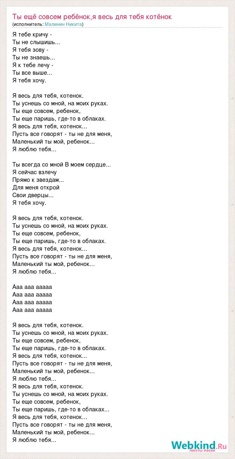 Я тебе кричу - Ты не слышишь... Я тебя зову - Ты не знаешь... Я к тебе лечу - Ты все выше... Я тебя хочу. Я весь для тебя, котенок. Ты уснешь со мной, на моих руках. Ты еще совсем, ребенок, Ты еще паришь, где-то в облаках. Я весь для тебя, котенок... Пусть все говорят - ты не для меня, Маленький ты мой, ребенок... Я люблю тебя... Ты всегда со мной В моем сердце... Я сейчас взлечу Прямо к звездам... Для меня открой Свои дверцы... Я тебя хочу. Я весь для тебя, котенок. Ты уснешь со мной, на моих руках. Ты еще совсем, ребенок, Ты еще паришь, где-то в облаках. Я весь для тебя, котенок... Пусть все говорят - ты не для меня, Маленький ты мой, ребенок... Я люблю тебя... Ааа ааа ааааа Ааа ааа ааааа Ааа ааа ааааа Ааа ааа ааааа Я весь для тебя, котенок. Ты уснешь со мной, на моих руках. Ты еще совсем, ребенок, Ты еще паришь, где-то в облаках. Я весь для тебя, котенок... Пусть все говорят - ты не для меня, Маленький ты мой, ребенок... Я люблю тебя... Я весь для тебя, котенок. Ты уснешь со мной, на моих руках. Ты еще совсем, ребенок, Ты еще паришь, где-то в облаках... Я весь для тебя, котенок... Пусть все говорят - ты не для меня, Маленький ты мой, ребенок... Я люблю тебя...