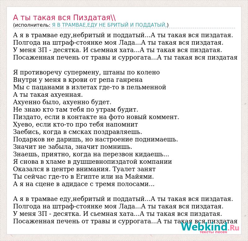 А я в трамвае еду,небритый и поддатый...А ты такая вся пиздатая. Полгода на штраф-стоянке моя Лада...А ты такая вся пиздатая. У меня ЗП - десятка. И сьемная хата...А ты такая вся пиздатая. Посаженная печень от травы и суррогата...А ты такая вся пиздатая Я противоречу супермену, штаны по колено Внутри у меня в крови от репа ганрена Мы с пацанами в излетах где-то в пельменной А ты такая ахуенная. Ахуенно было, ахуенно будет. Не знаю кто там тебя по утрам будит. Пиздато, если в контакте на фото новый коммент. Хуево, если кто-то про тебя напомнит Заебись, когда в смсках поздравляешь. Подарков не даришь, но настроение поднимаешь. Значит не забыла, значит помнишь. Знаешь, приятно, когда на перезвон кидаешь... Я снова в хламе в душшевнопиздатой компании Оказался в центре внимания. Туалет занят Ты сейчас где-то в Египте или на Майями. А я на сцене в адидасе с тремя полосами... А я в трамвае еду,небритый и поддатый...А ты такая вся пиздатая. Полгода на штраф-стоянке моя Лада...А ты такая вся пиздатая. У меня ЗП - десятка. И сьемная хата...А ты такая вся пиздатая. Посаженная печень от травы и суррогата...А ты такая вся пиздатая