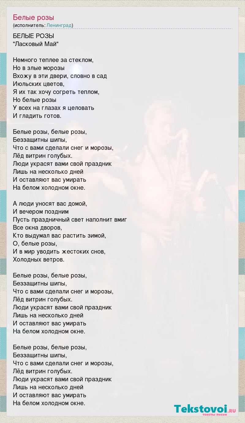 БЕЛЫЕ РОЗЫ "Ласковый Май" Немного теплее за стеклом, Но в злые морозы Вхожу в эти двери, словно в сад Июльских цветов, Я их так хочу согреть теплом, Но белые розы У всех на глазах я целовать И гладить готов. Белые розы, белые розы, Беззащитны шипы, Что с вами сделали снег и морозы, Лёд витрин голубых. Люди украсят вами свой праздник Лишь на несколько дней И оставляют вас умирать На белом холодном окне. А люди уносят вас домой, И вечером поздним Пусть праздничный свет наполнит вмиг Все окна дворов, Кто выдумал вас растить зимой, О, белые розы, И в мир уводить жестоких снов, Холодных ветров. Белые розы, белые розы, Беззащитны шипы, Что с вами сделали снег и морозы, Лёд витрин голубых. Люди украсят вами свой праздник Лишь на несколько дней И оставляют вас умирать На белом холодном окне. Белые розы, белые розы, Беззащитны шипы, Что с вами сделали снег и морозы, Лёд витрин голубых. Люди украсят вами свой праздник Лишь на несколько дней И оставляют вас умирать На белом холодном окне.