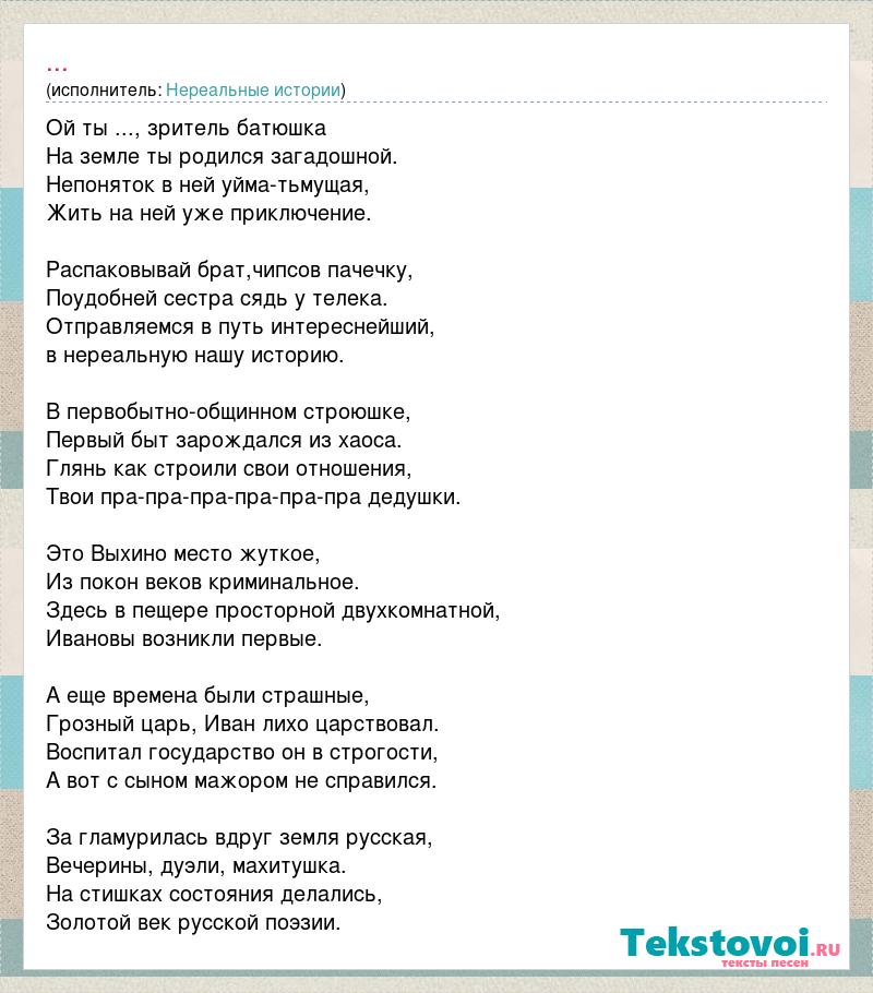 Ой ты ..., зритель батюшка На земле ты родился загадошной. Непоняток в ней уйма-тьмущая, Жить на ней уже приключение. Распаковывай брат,чипсов пачечку, Поудобней сестра сядь у телека. Отправляемся в путь интереснейший, в нереальную нашу историю. В первобытно-общинном строюшке, Первый быт зарождался из хаоса. Глянь как строили свои отношения, Твои пра-пра-пра-пра-пра-пра дедушки. Это Выхино место жуткое, Из покон веков криминальное. Здесь в пещере просторной двухкомнатной, Ивановы возникли первые. А еще времена были страшные, Грозный царь, Иван лихо царствовал. Воспитал государство он в строгости, А вот с сыном мажором не справился. За гламурилась вдруг земля русская, Вечерины, дуэли, махитушка. На стишках состояния делались, Золотой век русской поэзии.