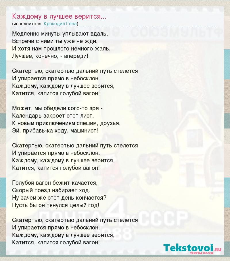 Медленно минуты уплывают вдаль, Встречи с ними ты уже не жди. И хотя нам прошлого немного жаль, Лучшее, конечно, - впереди! Скатертью, скатертью дальний путь стелется И упирается прямо в небосклон. Каждому, каждому в лучшее верится, Катится, катится голубой вагон! Может, мы обидели кого-то зря - Календарь закроет этот лист. К новым приключениям спешим, друзья, Эй, прибавь-ка ходу, машинист! Скатертью, скатертью дальний путь стелется И упирается прямо в небосклон. Каждому, каждому в лучшее верится, Катится, катится голубой вагон! Голубой вагон бежит-качается, Скорый поезд набирает ход. Ну зачем же этот день кончается? Пусть бы он тянулся целый год! Скатертью, скатертью дальний путь стелется И упирается прямо в небосклон. Каждому, каждому в лучшее верится, Катится, катится голубой вагон!