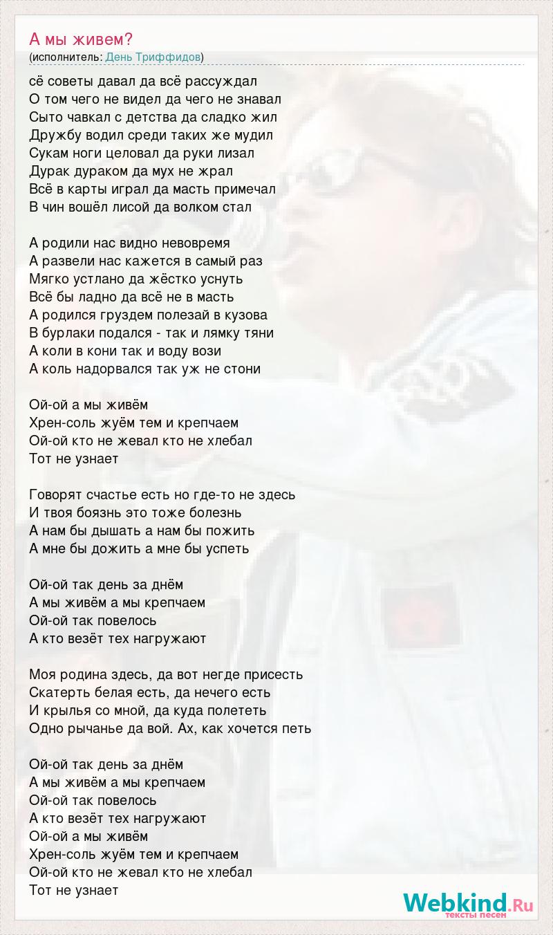сё советы давал да всё рассуждал О том чего не видел да чего не знавал Сыто чавкал с детства да сладко жил Дружбу водил среди таких же мудил Сукам ноги целовал да руки лизал Дурак дураком да мух не жрал Всё в карты играл да масть примечал В чин вошёл лисой да волком стал А родили нас видно невовремя А развели нас кажется в самый раз Мягко устлано да жёстко уснуть Всё бы ладно да всё не в масть А родился груздем полезай в кузова В бурлаки подался - так и лямку тяни А коли в кони так и воду вози А коль надорвался так уж не стони Ой-ой а мы живём Хрен-соль жуём тем и крепчаем Ой-ой кто не жевал кто не хлебал Тот не узнает Говорят счастье есть но где-то не здесь И твоя боязнь это тоже болезнь А нам бы дышать а нам бы пожить А мне бы дожить а мне бы успеть Ой-ой так день за днём А мы живём а мы крепчаем Ой-ой так повелось А кто везёт тех нагружают Моя родина здесь, да вот негде присесть Скатерть белая есть, да нечего есть И крылья со мной, да куда полететь Одно рычанье да вой. Ах, как хочется петь Ой-ой так день за днём А мы живём а мы крепчаем Ой-ой так повелось А кто везёт тех нагружают Ой-ой а мы живём Хрен-соль жуём тем и крепчаем Ой-ой кто не жевал кто не хлебал Тот не узнает