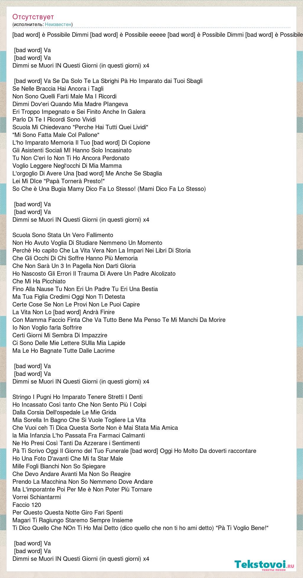Come è Possibile Dimmi Come è Possibile eeeee Come è Possibile Dimmi Come è Possibile Dimmi Come Va Dimmi Come Va Dimmi se Muori IN Questi Giorni (in questi giorni) x4 Dimmi Come Va Se Da Solo Te La Sbrighi Pà Ho Imparato dai Tuoi Sbagli Se Nelle Braccia Hai Ancora i Tagli Non Sono Quelli Farti Male Ma I Ricordi Dimmi Dov'eri Quando Mia Madre PIangeva Eri Troppo Impegnato e Sei Finito Anche In Galera Parlo Di Te I Ricordi Sono Vividi Scuola Mi Chiedevano "Perche Hai Tutti Quei Lividi" "Mi Sono Fatta Male Col Pallone" L'ho Imparato Memoria Il Tuo Cazzo Di Copione Gli Asistenti Sociali MI Hanno Solo Incasinato Tu Non C'eri Io Non Ti Ho Ancora Perdonato Voglio Leggere Negl'occhi Di Mia Mamma L'orgoglio Di Avere Una Figlia Come Me Anche Se Sbaglia Lei Mi DIce "Papà Tornerà Presto!" So Che è Una Bugia Mamy Dico Fa Lo Stesso! (Mami Dico Fa Lo Stesso) Dimmi Come Va Dimmi Come Va Dimmi se Muori IN Questi Giorni (in questi giorni) x4 Scuola Sono Stata Un Vero Fallimento Non Ho Avuto Voglia Di Studiare Nemmeno Un Momento Perchè Ho capito Che La Vita Vera Non La Impari Nei Libri Di Storia Che Gli Occhi Di Chi Soffre Hanno Più Memoria Che Non Sarà Un 3 In Pagella Non Darti Gloria Ho Nascosto Gli Errori Il Trauma Di Avere Un Padre Alcolizato Che Mi Ha Picchiato Fino Alla Nause Tu Non Eri Un Padre Tu Eri Una Bestia Ma Tua Figlia Credimi Oggi Non Ti Detesta Certe Cose Se Non Le Provi Non Le Puoi Capire La Vita Non Lo Sai Come Andrà Finire Con Mamma Faccio Finta Che Va Tutto Bene Ma Penso Te Mi Manchi Da Morire Io Non Voglio farla Soffrire Certi Giorni Mi Sembra Di Impazzire Ci Sono Delle Mie Lettere SUlla Mia Lapide Ma Le Ho Bagnate Tutte Dalle Lacrime Dimmi Come Va Dimmi Come Va Dimmi se Muori IN Questi Giorni (in questi giorni) x4 Stringo I Pugni Ho Imparato Tenere Stretti I Denti Ho Incassato Così tanto Che Non Sento Più I Colpi Dalla Corsia Dell'ospedale Le Mie Grida Mia Sorella In Bagno Che Si Vuole Togliere La Vita Che Vuoi ceh Ti Dica Questa Sorte Non è Mai Stata Mia Amica la Mia Infanzia L'ho Passata Fra Farmaci Calmanti Ne Ho Presi Così Tanti Da Azzerare i Sentimenti Pà Ti Scrivo Oggi Il Giorno del Tuo Funerale Comincio Oggi Ho Molto Da doverti raccontare Ho Una Foto D'avanti Che Mi fa Star Male Mille Fogli Bianchi Non So Spiegare Che Devo Andare Avanti Ma Non So Reagire Prendo La Macchina Non So Nemmeno Dove Andare Ma L'imporatnte Poi Per Me è Non Poter Più Tornare Vorrei Schiantarmi Faccio 120 Per Questo Questa Notte Giro Fari Spenti Magari Ti Ragiungo Staremo Sempre Insieme Ti Dico Quello Che NOn Ti Ho Mai Detto (dico quello che non ti ho ami detto) "Pà Ti Voglio Bene!" Dimmi Come Va Dimmi Come Va Dimmi se Muori IN Questi Giorni (in questi giorni) x4