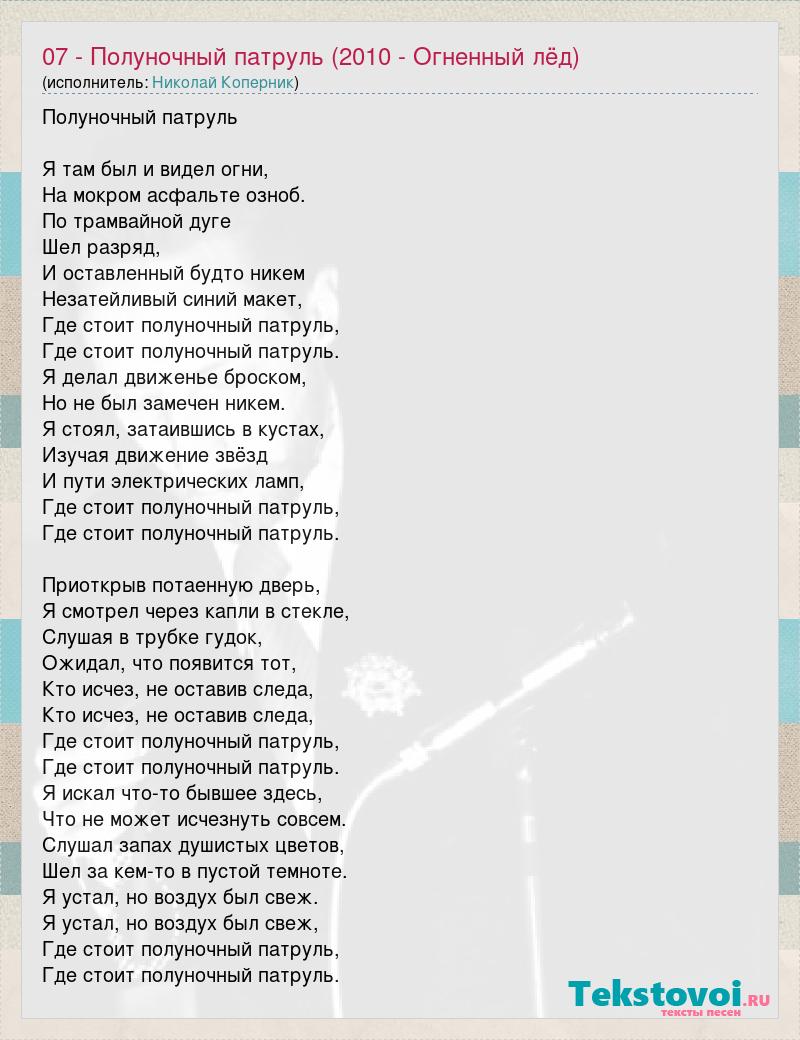 Полуночный патруль Я там был и видел огни, На мокром асфальте озноб. По трамвайной дуге Шел разряд, И оставленный будто никем Незатейливый синий макет, Где стоит полуночный патруль, Где стоит полуночный патруль. Я делал движенье броском, Но не был замечен никем. Я стоял, затаившись в кустах, Изучая движение звёзд И пути электрических ламп, Где стоит полуночный патруль, Где стоит полуночный патруль. Приоткрыв потаенную дверь, Я смотрел через капли в стекле, Слушая в трубке гудок, Ожидал, что появится тот, Кто исчез, не оставив следа, Кто исчез, не оставив следа, Где стоит полуночный патруль, Где стоит полуночный патруль. Я искал что-то бывшее здесь, Что не может исчезнуть совсем. Слушал запах душистых цветов, Шел за кем-то в пустой темноте. Я устал, но воздух был свеж. Я устал, но воздух был свеж, Где стоит полуночный патруль, Где стоит полуночный патруль.