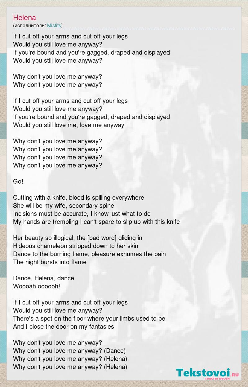 If I cut off your arms and cut off your legs Would you still love me anyway? If you're bound and you're gagged, draped and displayed Would you still love me anyway? Why don't you love me anyway? Why don't you love me anyway? If I cut off your arms and cut off your legs Would you still love me anyway? If you're bound and you're gagged, draped and displayed Would you still love me, love me anyway Why don't you love me anyway? Why don't you love me anyway? Why don't you love me anyway? Why don't you love me anyway? Go! Cutting with a knife, blood is spilling everywhere She will be my wife, secondary spine Incisions must be accurate, I know just what to do My hands are trembling I can't spare to slip up with this knife Her beauty so illogical, the beast come gliding in Hideous chameleon stripped down to her skin Dance to the burning flame, pleasure exhumes the pain The night bursts into flame Dance, Helena, dance Woooah oooooh! If I cut off your arms and cut off your legs Would you still love me anyway? There's a spot on the floor where your limbs used to be And I close the door on my fantasies Why don't you love me anyway? Why don't you love me anyway? (Dance) Why don't you love me anyway? (Helena) Why don't you love me anyway? (Helena)