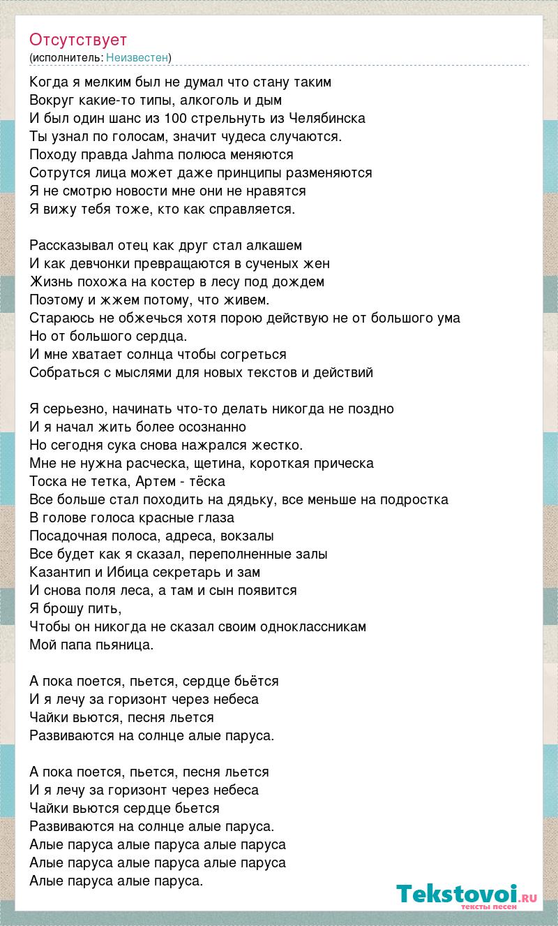 Когда я мелким был не думал что стану таким Вокруг какие-то типы, алкоголь и дым И был один шанс из 100 стрельнуть из Челябинска Ты узнал по голосам, значит чудеса случаются. Походу правда Jahma полюса меняются Сотрутся лица может даже принципы разменяются Я не смотрю новости мне они не нравятся Я вижу тебя тоже, кто как справляется. Рассказывал отец как друг стал алкашем И как девчонки превращаются в сученых жен Жизнь похожа на костер в лесу под дождем Поэтому и жжем потому, что живем. Стараюсь не обжечься хотя порою действую не от большого ума Но от большого сердца. И мне хватает солнца чтобы согреться Собраться с мыслями для новых текстов и действий Я серьезно, начинать что-то делать никогда не поздно И я начал жить более осознанно Но сегодня сука снова нажрался жестко. Мне не нужна расческа, щетина, короткая прическа Тоска не тетка, Артем - тёска Все больше стал походить на дядьку, все меньше на подростка В голове голоса красные глаза Посадочная полоса, адреса, вокзалы Все будет как я сказал, переполненные залы Казантип и Ибица секретарь и зам И снова поля леса, а там и сын появится Я брошу пить, Чтобы он никогда не сказал своим одноклассникам Мой папа пьяница. А пока поется, пьется, сердце бьётся И я лечу за горизонт через небеса Чайки вьются, песня льется Развиваются на солнце алые паруса. А пока поется, пьется, песня льется И я лечу за горизонт через небеса Чайки вьются сердце бьется Развиваются на солнце алые паруса. Алые паруса алые паруса алые паруса Алые паруса алые паруса алые паруса Алые паруса алые паруса.