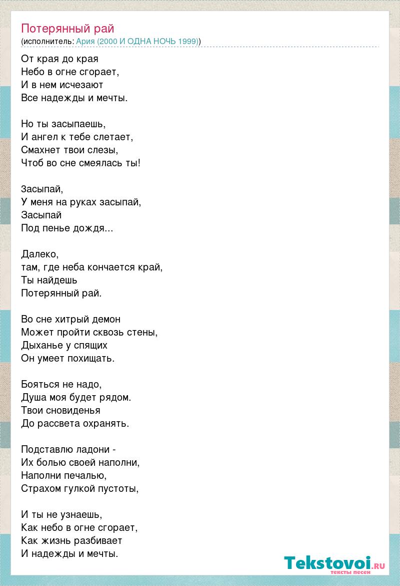 От края до края Небо в огне сгорает, И в нем исчезают Все надежды и мечты. Но ты засыпаешь, И ангел к тебе слетает, Смахнет твои слезы, Чтоб во сне смеялась ты! 3асыпай, У меня на руках засыпай, Засыпай Под пенье дождя... Далеко, там, где неба кончается край, Ты найдешь Потерянный рай. Во сне хитрый демон Может пройти сквозь стены, Дыханье у спящих Он умеет похищать. Бояться не надо, Душа моя будет рядом. Твои сновиденья До рассвета охранять. Подставлю ладони - Их болью своей наполни, Наполни печалью, Страхом гулкой пустоты, И ты не узнаешь, Как небо в огне сгорает, Как жизнь разбивает И надежды и мечты.