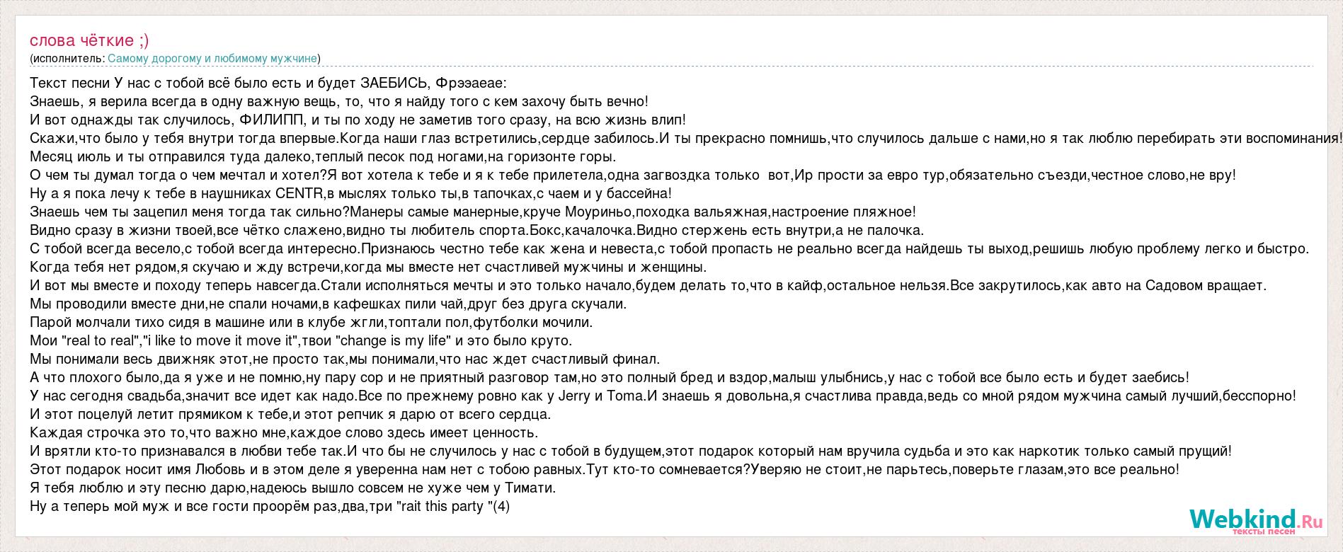 Текст песни У нас с тобой всё было есть и будет ЗАЕБИСЬ, Фрээаеае: Знаешь, я верила всегда в одну важную вещь, то, что я найду того с кем захочу быть вечно! И вот однажды так случилось, ФИЛИПП, и ты по ходу не заметив того сразу, на всю жизнь влип! Скажи,что было у тебя внутри тогда впервые.Когда наши глаз встретились,сердце забилось.И ты прекрасно помнишь,что случилось дальше с нами,но я так люблю перебирать эти воспоминания! Месяц июль и ты отправился туда далеко,теплый песок под ногами,на горизонте горы. О чем ты думал тогда о чем мечтал и хотел?Я вот хотела к тебе и я к тебе прилетела,одна загвоздка только вот,Ир прости за евро тур,обязательно съезди,честное слово,не вру! Ну а я пока лечу к тебе в наушниках CENTR,в мыслях только ты,в тапочках,с чаем и у бассейна! Знаешь чем ты зацепил меня тогда так сильно?Манеры самые манерные,круче Моуриньо,походка вальяжная,настроение пляжное! Видно сразу в жизни твоей,все чётко слажено,видно ты любитель спорта.Бокс,качалочка.Видно стержень есть внутри,а не палочка. С тобой всегда весело,с тобой всегда интересно.Признаюсь честно тебе как жена и невеста,с тобой пропасть не реально всегда найдешь ты выход,решишь любую проблему легко и быстро. Когда тебя нет рядом,я скучаю и жду встречи,когда мы вместе нет счастливей мужчины и женщины. И вот мы вместе и походу теперь навсегда.Стали исполняться мечты и это только начало,будем делать то,что в кайф,остальное нельзя.Все закрутилось,как авто на Садовом вращает. Мы проводили вместе дни,не спали ночами,в кафешках пили чай,друг без друга скучали. Парой молчали тихо сидя в машине или в клубе жгли,топтали пол,футболки мочили. Мои "real to real","i like to move it move it",твои "change is my life" и это было круто. Мы понимали весь движняк этот,не просто так,мы понимали,что нас ждет счастливый финал. А что плохого было,да я уже и не помню,ну пару сор и не приятный разговор там,но это полный бред и вздор,малыш улыбнись,у нас с тобой все было есть и будет заебись! У нас сегодня свадьба,значит все идет как надо.Все по прежнему ровно как у Jerry и Toma.И знаешь я довольна,я счастлива правда,ведь со мной рядом мужчина самый лучший,бесспорно! И этот поцелуй летит прямиком к тебе,и этот репчик я дарю от всего сердца. Каждая строчка это то,что важно мне,каждое слово здесь имеет ценность. И врятли кто-то признавался в любви тебе так.И что бы не случилось у нас с тобой в будущем,этот подарок который нам вручила судьба и это как наркотик только самый прущий! Этот подарок носит имя Любовь и в этом деле я уверенна нам нет с тобою равных.Тут кто-то сомневается?Уверяю не стоит,не парьтесь,поверьте глазам,это все реально! Я тебя люблю и эту песню дарю,надеюсь вышло совсем не хуже чем у Тимати. Ну а теперь мой муж и все гости проорём раз,два,три "rait this party "(4)