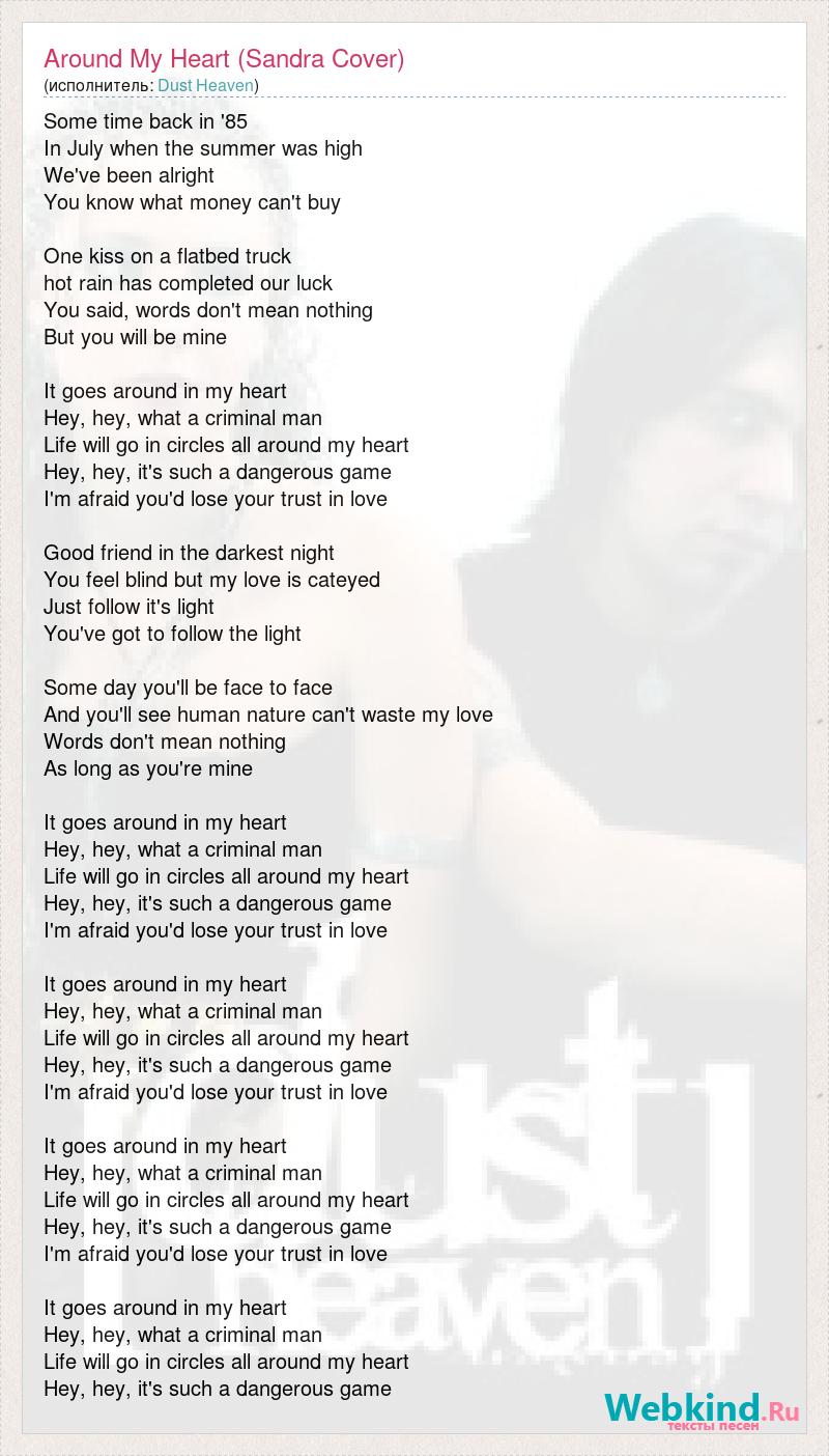 Some time back in '85 In July when the summer was high We've been alright You know what money can't buy One kiss on a flatbed truck hot rain has completed our luck You said, words don't mean nothing But you will be mine It goes around in my heart Hey, hey, what a criminal man Life will go in circles all around my heart Hey, hey, it's such a dangerous game I'm afraid you'd lose your trust in love Good friend in the darkest night You feel blind but my love is cateyed Just follow it's light You've got to follow the light Some day you'll be face to face And you'll see human nature can't waste my love Words don't mean nothing As long as you're mine It goes around in my heart Hey, hey, what a criminal man Life will go in circles all around my heart Hey, hey, it's such a dangerous game I'm afraid you'd lose your trust in love It goes around in my heart Hey, hey, what a criminal man Life will go in circles all around my heart Hey, hey, it's such a dangerous game I'm afraid you'd lose your trust in love It goes around in my heart Hey, hey, what a criminal man Life will go in circles all around my heart Hey, hey, it's such a dangerous game I'm afraid you'd lose your trust in love It goes around in my heart Hey, hey, what a criminal man Life will go in circles all around my heart Hey, hey, it's such a dangerous game
