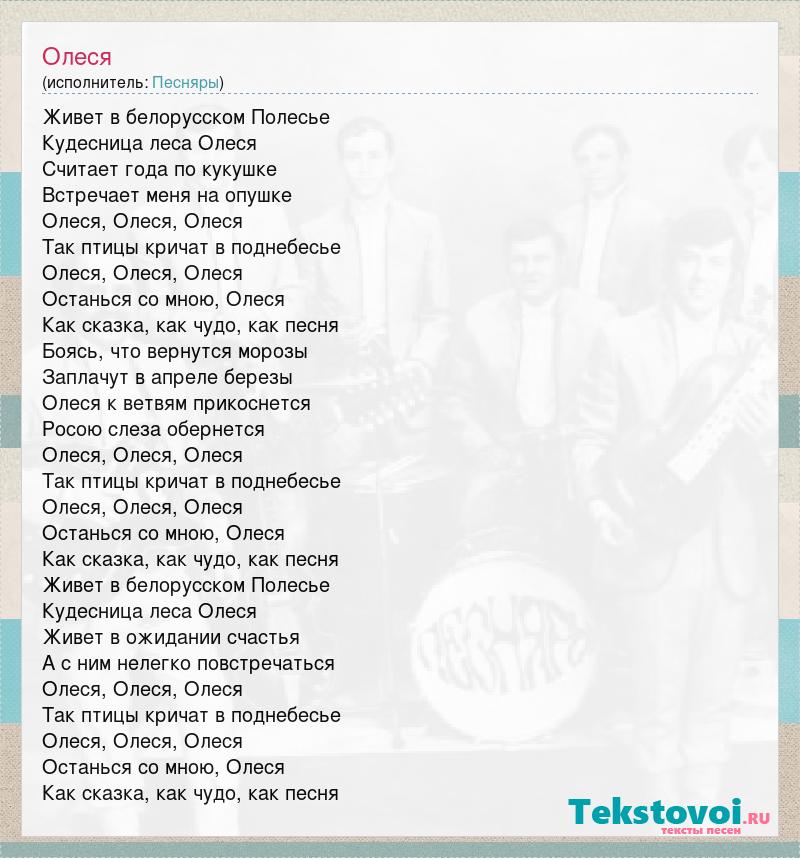 Живет в белорусском Полесье Кудесница леса Олеся Считает года по кукушке Встречает меня на опушке Олеся, Олеся, Олеся Так птицы кричат в поднебесье Олеся, Олеся, Олеся Останься со мною, Олеся Как сказка, как чудо, как песня Боясь, что вернутся морозы Заплачут в апреле березы Олеся к ветвям прикоснется Росою слеза обернется Олеся, Олеся, Олеся Так птицы кричат в поднебесье Олеся, Олеся, Олеся Останься со мною, Олеся Как сказка, как чудо, как песня Живет в белорусском Полесье Кудесница леса Олеся Живет в ожидании счастья А с ним нелегко повстречаться Олеся, Олеся, Олеся Так птицы кричат в поднебесье Олеся, Олеся, Олеся Останься со мною, Олеся Как сказка, как чудо, как песня
