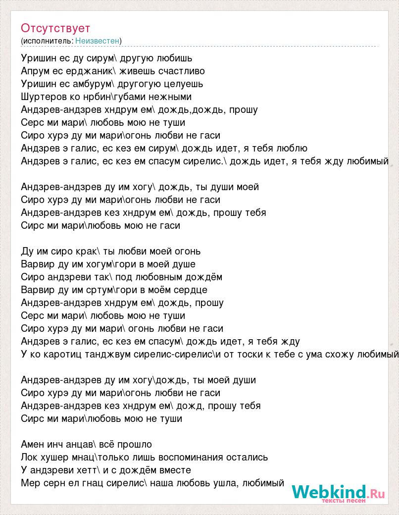 Уришин ес ду сирум\ другую любишь Апрум ес ерджаник\ живешь счастливо Уришин ес амбурум\ другогую целуешь Шуртеров ко нрбин\губами нежными Андзрев-андзрев хндрум ем\ дождь,дождь, прошу Серс ми мари\ любовь мою не туши Сиро хурэ ду ми мари\огонь любви не гаси Андзрев э галис, ес кез ем сирум\ дождь идет, я тебя люблю Андзрев э галис, ес кез ем спасум сирелис.\ дождь идет, я тебя жду любимый Андзрев-андзрев ду им хогу\ дождь, ты души моей Сиро хурэ ду ми мари\огонь любви не гаси Андзрев-андзрев кез хндрум ем\ дождь, прошу тебя Сирс ми мари\любовь мою не гаси Ду им сиро крак\ ты любви моей огонь Варвир ду им хогум\гори в моей душе Сиро андзреви так\ под любовным дождём Варвир ду им сртум\гори в моём сердце Андзрев-андзрев хндрум ем\ дождь, прошу Серс ми мари\ любовь мою не туши Сиро хурэ ду ми мари\ огонь любви не гаси Андзрев э галис, ес кез ем спасум\ дождь идет, я тебя жду У ко каротиц танджвум сирелис-сирелис\и от тоски к тебе с ума схожу любимый Андзрев-андзрев ду им хогу\дождь, ты моей души Сиро хурэ ду ми мари\огонь любви не гаси Андзрев-андзрев кез хндрум ем\ дожд, прошу тебя Сирс ми мари\любовь мою не туши Амен инч анцав\ всё прошло Лок хушер мнац\только лишь воспоминания остались У андзреви хетт\ и с дождём вместе Мер серн ел гнац сирелис\ наша любовь ушла, любимый