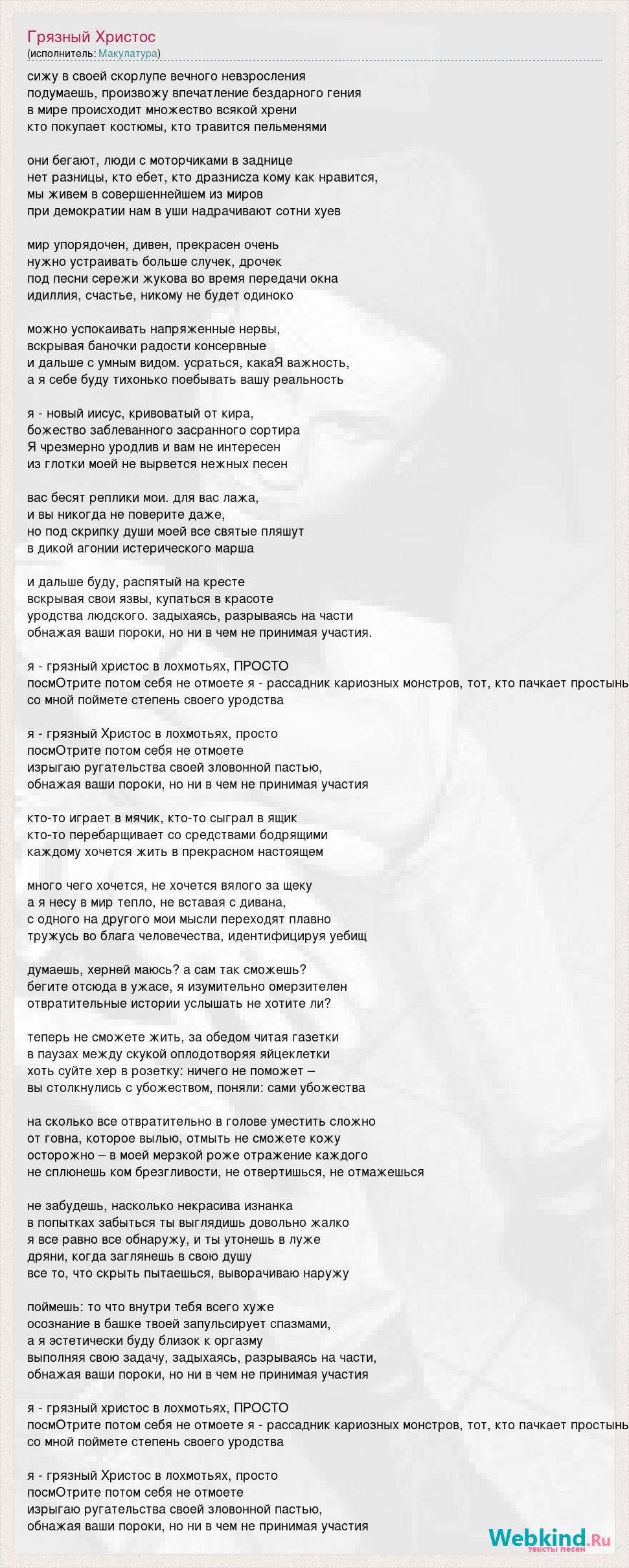 сижу в своей скорлупе вечного невзросления подумаешь, произвожу впечатление бездарного гения в мире происходит множество всякой хрени кто покупает костюмы, кто травится пельменями они бегают, люди с моторчиками в заднице нет разницы, кто ебет, кто дразниczа кому как нравится, мы живем в совершеннейшем из миров при демократии нам в уши надрачивают сотни хуев мир упорядочен, дивен, прекрасен очень нужно устраивать больше случек, дрочек под песни сережи жукова во время передачи окна идиллия, счастье, никому не будет одиноко можно успокаивать напряженные нервы, вскрывая баночки радости консервные и дальше с умным видом. усраться, какаЯ важность, а я себе буду тихонько поебывать вашу реальность я - новый иисус, кривоватый от кира, божество заблеванного засранного сортира Я чрезмерно уродлив и вам не интересен из глотки моей не вырвется нежных песен вас бесят реплики мои. для вас лажа, и вы никогда не поверите даже, но под скрипку души моей все святые пляшут в дикой агонии истерического марша и дальше буду, распятый на кресте вскрывая свои язвы, купаться в красоте уродства людского. задыхаясь, разрываясь на части обнажая ваши пороки, но ни в чем не принимая участия. я - грязный христос в лохмотьях, ПРОСТО посмОтрите потом себя не отмоете я - рассадник кариозных монстров, тот, кто пачкает простынь со мной поймете степень своего уродства я - грязный Христос в лохмотьях, просто посмОтрите потом себя не отмоете изрыгаю ругательства своей зловонной пастью, обнажая ваши пороки, но ни в чем не принимая участия кто-то играет в мячик, кто-то сыграл в ящик кто-то перебарщивает со средствами бодрящими каждому хочется жить в прекрасном настоящем много чего хочется, не хочется вялого за щеку а я несу в мир тепло, не вставая с дивана, с одного на другого мои мысли переходят плавно тружусь во блага человечества, идентифицируя уебищ думаешь, херней маюсь? а сам так сможешь? бегите отсюда в ужасе, я изумительно омерзителен отвратительные истории услышать не хотите ли? теперь не сможете жить, за обедом читая газетки в паузах между скукой оплодотворяя яйцеклетки хоть суйте хер в розетку: ничего не поможет – вы столкнулись с убожеством, поняли: сами убожества на сколько все отвратительно в голове уместить сложно от говна, которое вылью, отмыть не сможете кожу осторожно – в моей мерзкой роже отражение каждого не сплюнешь ком брезгливости, не отвертишься, не отмажешься не забудешь, насколько некрасива изнанка в попытках забыться ты выглядишь довольно жалко я все равно все обнаружу, и ты утонешь в луже дряни, когда заглянешь в свою душу все то, что скрыть пытаешься, выворачиваю наружу поймешь: то что внутри тебя всего хуже осознание в башке твоей запульсирует спазмами, а я эстетически буду близок к оргазму выполняя свою задачу, задыхаясь, разрываясь на части, обнажая ваши пороки, но ни в чем не принимая участия я - грязный христос в лохмотьях, ПРОСТО посмОтрите потом себя не отмоете я - рассадник кариозных монстров, тот, кто пачкает простынь со мной поймете степень своего уродства я - грязный Христос в лохмотьях, просто посмОтрите потом себя не отмоете изрыгаю ругательства своей зловонной пастью, обнажая ваши пороки, но ни в чем не принимая участия