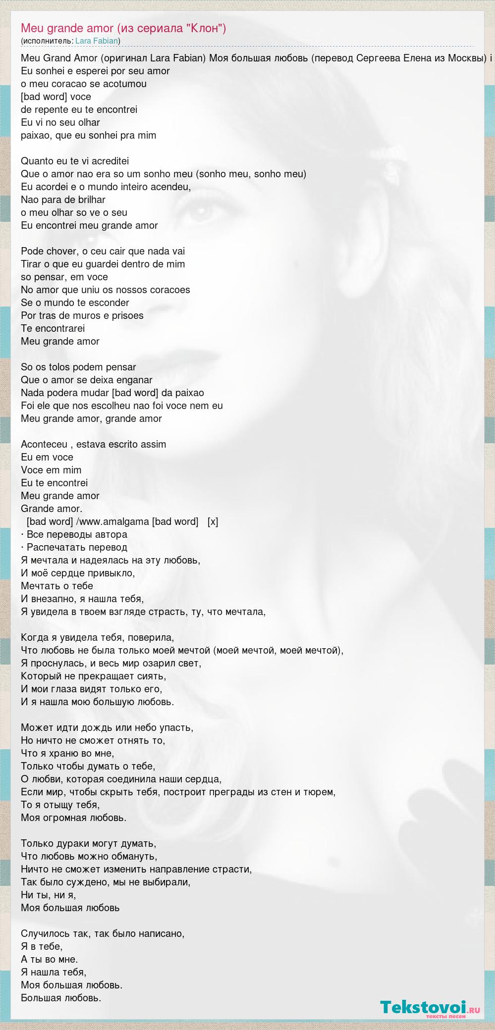 Meu Grand Amor (оригинал Lara Fabian) Моя большая любовь (перевод Сергеева Елена из Москвы) i Eu sonhei e esperei por seu amor o meu coracao se acotumou sonhar com voce de repente eu te encontrei Eu vi no seu olhar paixao, que eu sonhei pra mim Quanto eu te vi acreditei Que o amor nao era so um sonho meu (sonho meu, sonho meu) Eu acordei e o mundo inteiro acendeu, Nao para de brilhar o meu olhar so ve o seu Eu encontrei meu grande amor Pode chover, o ceu cair que nada vai Tirar o que eu guardei dentro de mim so pensar, em voce No amor que uniu os nossos coracoes Se o mundo te esconder Por tras de muros e prisoes Te encontrarei Meu grande amor So os tolos podem pensar Que o amor se deixa enganar Nada podera mudar os rumos da paixao Foi ele que nos escolheu nao foi voce nem eu Meu grande amor, grande amor Aconteceu , estava escrito assim Eu em voce Voce em mim Eu te encontrei Meu grande amor Grande amor. [bad word] /www.amalgama [bad word] [x] · Все переводы автора · Распечатать перевод Я мечтала и надеялась на эту любовь, И моё сердце привыкло, Мечтать о тебе И внезапно, я нашла тебя, Я увидела в твоем взгляде страсть, ту, что мечтала, Когда я увидела тебя, поверила, Что любовь не была только моей мечтой (моей мечтой, моей мечтой), Я проснулась, и весь мир озарил свет, Который не прекращает сиять, И мои глаза видят только его, И я нашла мою большую любовь. Может идти дождь или небо упасть, Но ничто не сможет отнять то, Что я храню во мне, Только чтобы думать о тебе, О любви, которая соединила наши сердца, Если мир, чтобы скрыть тебя, построит преграды из стен и тюрем, То я отыщу тебя, Моя огромная любовь. Только дураки могут думать, Что любовь можно обмануть, Ничто не сможет изменить направление страсти, Так было суждено, мы не выбирали, Ни ты, ни я, Моя большая любовь Случилось так, так было написано, Я в тебе, А ты во мне. Я нашла тебя, Моя большая любовь. Большая любовь.