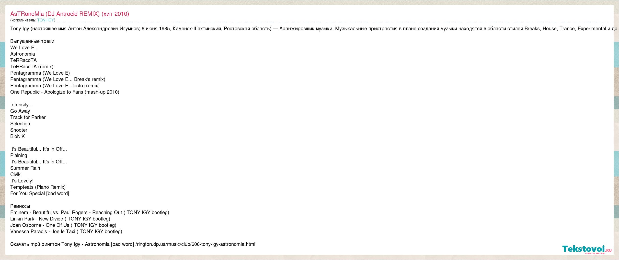 Tony Igy (настоящее имя Антон Александрович Игумнов; 6 июня 1985, Каменск-Шахтинский, Ростовская область) — Аранжировщик музыки. Музыкальные пристрастия в плане создания музыки находятся в области стилей Breaks, House, Trance, Experimental и др. Выпущенные треки We Love E... Astronomia TeRRacoTA TeRRacoTA (remix) Pentagramma (We Love E) Pentagramma (We Love E... Break's remix) Pentagramma (We Love E...lectro remix) One Republic - Apologize to Fans (mash-up 2010) Intensity... Go Away Track for Parker Selection Shooter BioNiK It's Beautiful... It's in Off... Plaining It's Beautiful... It's in Off... Summer Rain Civik It's Lovely! Tempteats (Piano Remix) For You Special (Instrumental) Ремиксы Eminem - Beautiful vs. Paul Rogers - Reaching Out ( TONY IGY bootleg) Linkin Park - New Divide ( TONY IGY bootleg) Joan Osborne - One Of Us ( TONY IGY bootleg) Vanessa Paradis - Joe le Taxi ( TONY IGY bootleg) Скачать mp3 рингтон Tony Igy - Astronomia [bad word] /rington.dp.ua/music/club/606-tony-igy-astronomia.html