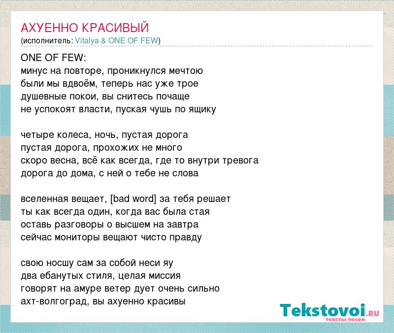 ONE OF FEW: минус на повторе, проникнулся мечтою были мы вдвоём, теперь нас уже трое душевные покои, вы снитесь почаще не успокоят власти, пуская чушь по ящику четыре колеса, ночь, пустая дорога пустая дорога, прохожих не много скоро весна, всё как всегда, где то внутри тревога дорога до дома, с ней о тебе не слова вселенная вещает, [bad word] за тебя решает ты как всегда один, когда вас была стая оставь разговоры о высшем на завтра сейчас мониторы вещают чисто правду свою носшу сам за собой неси яу два ебанутых стиля, целая миссия говорят на амуре ветер дует очень сильно ахт-волгоград, вы ахуенно красивы