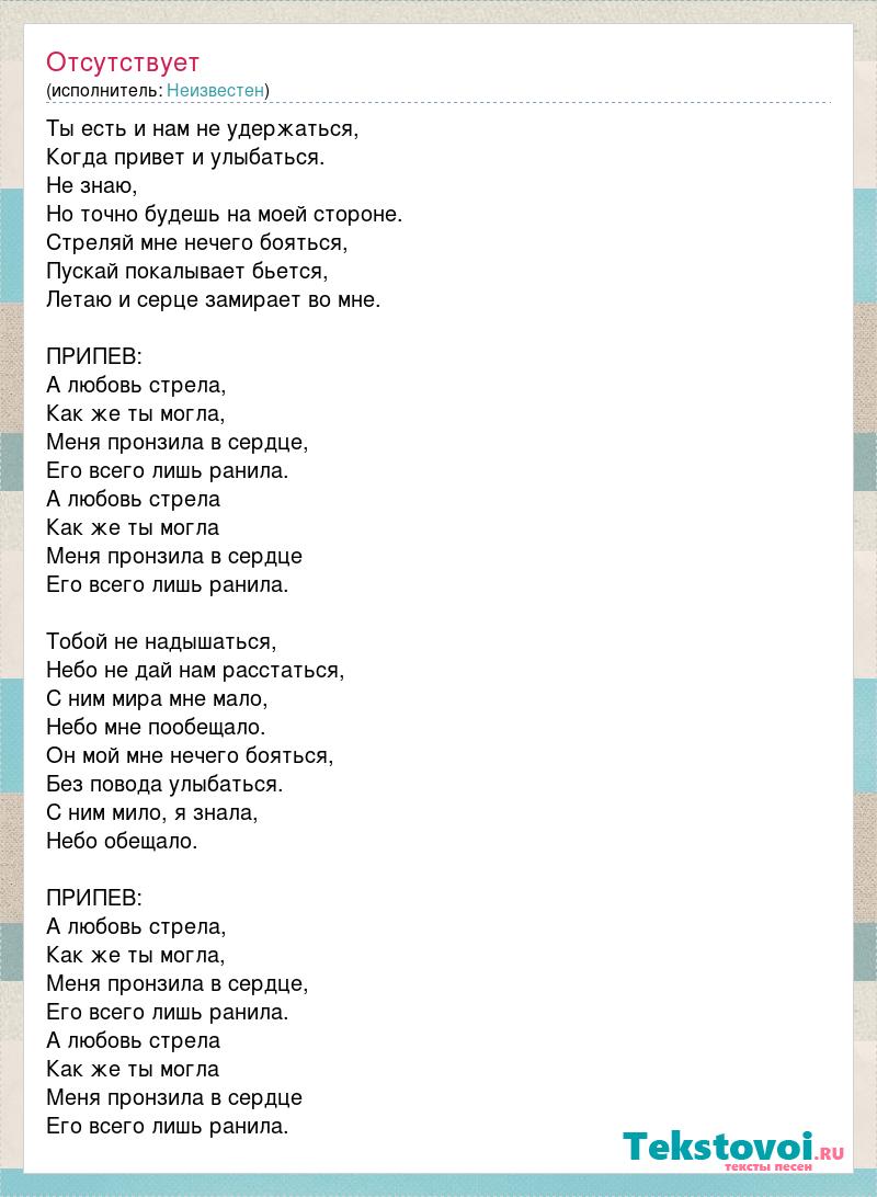 Ты есть и нам не удержаться, Когда привет и улыбаться. Не знаю, Но точно будешь на моей стороне. Стреляй мне нечего бояться, Пускай покалывает бьется, Летаю и серце замирает во мне. ПРИПЕВ: А любовь стрела, Как же ты могла, Меня пронзила в сердце, Его всего лишь ранила. А любовь стрела Как же ты могла Меня пронзила в сердце Его всего лишь ранила. Тобой не надышаться, Небо не дай нам расстаться, С ним мира мне мало, Небо мне пообещало. Он мой мне нечего бояться, Без повода улыбаться. С ним мило, я знала, Небо обещало. ПРИПЕВ: А любовь стрела, Как же ты могла, Меня пронзила в сердце, Его всего лишь ранила. А любовь стрела Как же ты могла Меня пронзила в сердце Его всего лишь ранила.
