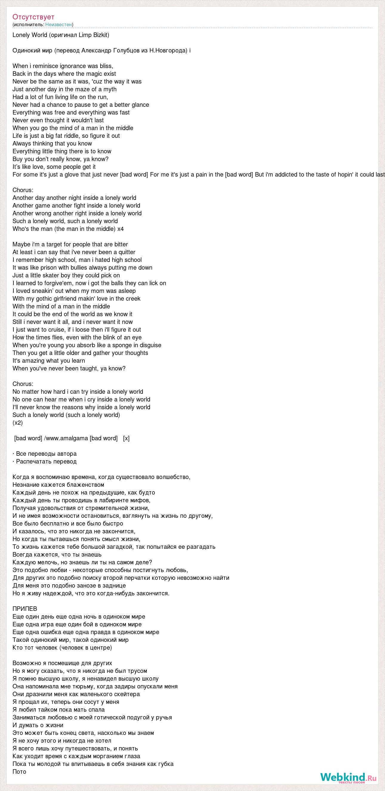 Lonely World (оригинал Limp Bizkit) Одинокий мир (перевод Александр Голубцов из Н.Новгорода) i When i reminisce ignorance was bliss, Back in the days where the magic exist Never be the same as it was, 'cuz the way it was Just another day in the maze of a myth Had a lot of fun living life on the run, Never had a chance to pause to get a better glance Everything was free and everything was fast Never even thought it wouldn't last When you go the mind of a man in the middle Life is just a big fat riddle, so figure it out Always thinking that you know Everything little thing there is to know Buy you don’t really know, ya know? It’s like love, some people get it For some it's just a glove that just never [bad word] For me it's just a pain in the [bad word] But i'm addicted to the taste of hopin' it could last Chorus: Another day another night inside a lonely world Another game another fight inside a lonely world Another wrong another right inside a lonely world Such a lonely world, such a lonely world Who's the man (the man in the middle) x4 Maybe i'm a target for people that are bitter At least i can say that i've never been a quitter I remember high school, man i hated high school It was like prison with bullies always putting me down Just a little skater boy they could pick on I learned to forgive'em, now i got the balls they can lick on I loved sneakin’ out when my mom was asleep With my gothic girlfriend makin' love in the creek With the mind of a man in the middle It could be the end of the world as we know it Still i never want it all, and i never want it now I just want to cruise, if i loose then i'll figure it out How the times flies, even with the blink of an eye When you're young you absorb like a sponge in disguise Then you get a little older and gather your thoughts It's amazing what you learn When you've never been taught, ya know? Chorus: No matter how hard i can try inside a lonely world No one can hear me when i cry inside a lonely world I'll never know the reasons why inside a lonely world Such a lonely world (such a lonely world) (x2) [bad word] /www.amalgama [bad word] [x] · Все переводы автора · Распечатать перевод Когда я воспоминаю времена, когда существовало волшебство, Незнание кажется блаженством Каждый день не похож на предыдущие, как будто Каждый день ты проводишь в лабиринте мифов, Получая удовольствия от стремительной жизни, И не имея возможности остановиться, взглянуть на жизнь по другому, Все было бесплатно и все было быстро И казалось, что это никогда не закончится, Но когда ты пытаешься понять смысл жизни, То жизнь кажется тебе большой загадкой, так попытайся ее разгадать Всегда кажется, что ты знаешь Каждую мелочь, но знаешь ли ты на самом деле? Это подобно любви - некоторые способны постигнуть любовь, Для других это подобно поиску второй перчатки которую невозможно найти Для меня это подобно занозе в заднице Но я живу надеждой, что это когда-нибудь закончится. ПРИПЕВ Еще один день еще одна ночь в одиноком мире Еще одна игра еще один бой в одиноком мире Еще одна ошибка еще одна правда в одиноком мире Такой одинокий мир, такой одинокий мир Кто тот человек (человек в центре) Возможно я посмешище для других Но я могу сказать, что я никогда не был трусом Я помню высшую школу, я ненавидел высшую школу Она напоминала мне тюрьму, когда задиры опускали меня Они дразнили меня как маленького скейтера Я прощал их, теперь они сосут у меня Я любил тайком пока мать спала Заниматься любовью с моей готической подугой у ручья И думать о жизни Это может быть конец света, насколько мы знаем Я не хочу этого и никогда не хотел Я всего лишь хочу путешествовать, и понять Как уходит время с каждым морганием глаза Пока ты молодой ты впитываешь в себя знания как губка Пото
