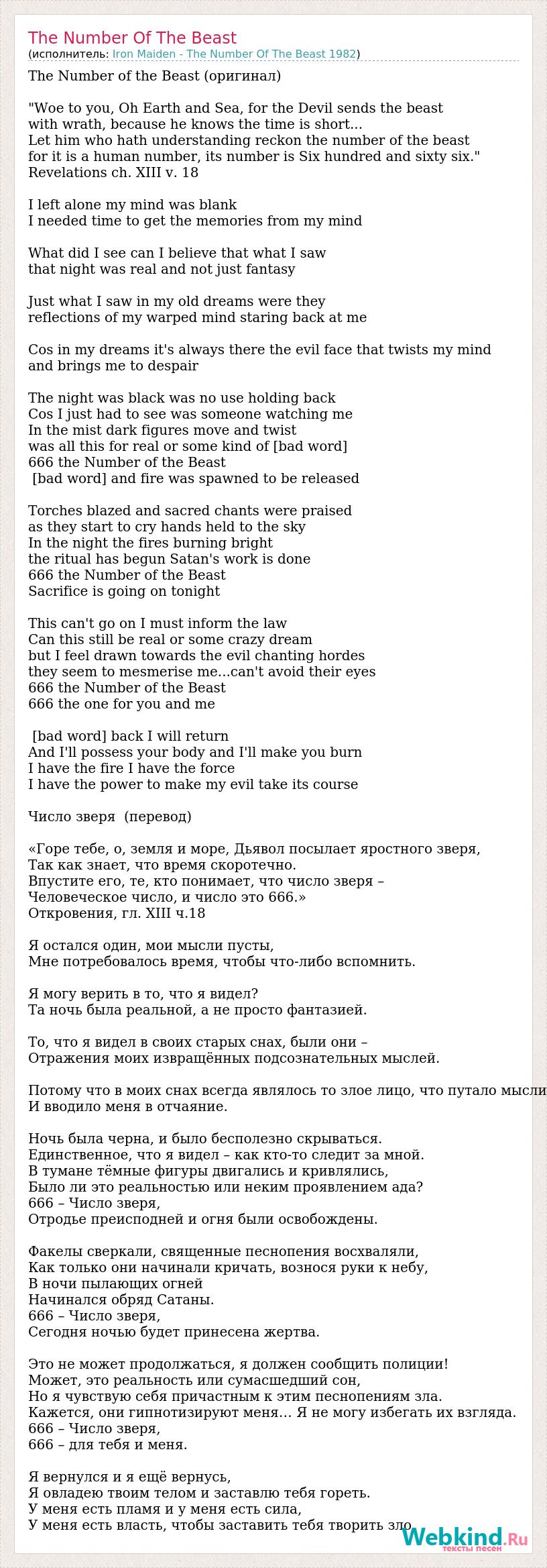 The Number of the Beast (оригинал) "Woe to you, Oh Earth and Sea, for the Devil sends the beast with wrath, because he knows the time is short... Let him who hath understanding reckon the number of the beast for it is a human number, its number is Six hundred and sixty six." Revelations ch. XIII v. 18 I left alone my mind was blank I needed time to get the memories from my mind What did I see can I believe that what I saw that night was real and not just fantasy Just what I saw in my old dreams were they reflections of my warped mind staring back at me Cos in my dreams it's always there the evil face that twists my mind and brings me to despair The night was black was no use holding back Cos I just had to see was someone watching me In the mist dark figures move and twist was all this for real or some kind of [bad word] 666 the Number of the Beast [bad word] and fire was spawned to be released Torches blazed and sacred chants were praised as they start to cry hands held to the sky In the night the fires burning bright the ritual has begun Satan's work is done 666 the Number of the Beast Sacrifice is going on tonight This can't go on I must inform the law Can this still be real or some crazy dream but I feel drawn towards the evil chanting hordes they seem to mesmerise me...can't avoid their eyes 666 the Number of the Beast 666 the one for you and me [bad word] back I will return And I'll possess your body and I'll make you burn I have the fire I have the force I have the power to make my evil take its course Число зверя (перевод) «Горе тебе, о, земля и море, Дьявол посылает яростного зверя, Так как знает, что время скоротечно. Впустите его, те, кто понимает, что число зверя – Человеческое число, и число это 666.» Откровения, гл. XIII ч.18 Я остался один, мои мысли пусты, Мне потребовалось время, чтобы что-либо вспомнить. Я могу верить в то, что я видел? Та ночь была реальной, а не просто фантазией. То, что я видел в своих старых снах, были они – Отражения моих извращённых подсознательных мыслей. Потому что в моих снах всегда являлось то злое лицо, что путало мысли И вводило меня в отчаяние. Ночь была черна, и было бесполезно скрываться. Единственное, что я видел – как кто-то следит за мной. В тумане тёмные фигуры двигались и кривлялись, Было ли это реальностью или неким проявлением ада? 666 – Число зверя, Отродье преисподней и огня были освобождены. Факелы сверкали, священные песнопения восхваляли, Как только они начинали кричать, вознося руки к небу, В ночи пылающих огней Начинался обряд Сатаны. 666 – Число зверя, Сегодня ночью будет принесена жертва. Это не может продолжаться, я должен сообщить полиции! Может, это реальность или сумасшедший сон, Но я чувствую себя причастным к этим песнопениям зла. Кажется, они гипнотизируют меня… Я не могу избегать их взгляда. 666 – Число зверя, 666 – для тебя и меня. Я вернулся и я ещё вернусь, Я овладею твоим телом и заставлю тебя гореть. У меня есть пламя и у меня есть сила, У меня есть власть, чтобы заставить тебя творить зло.