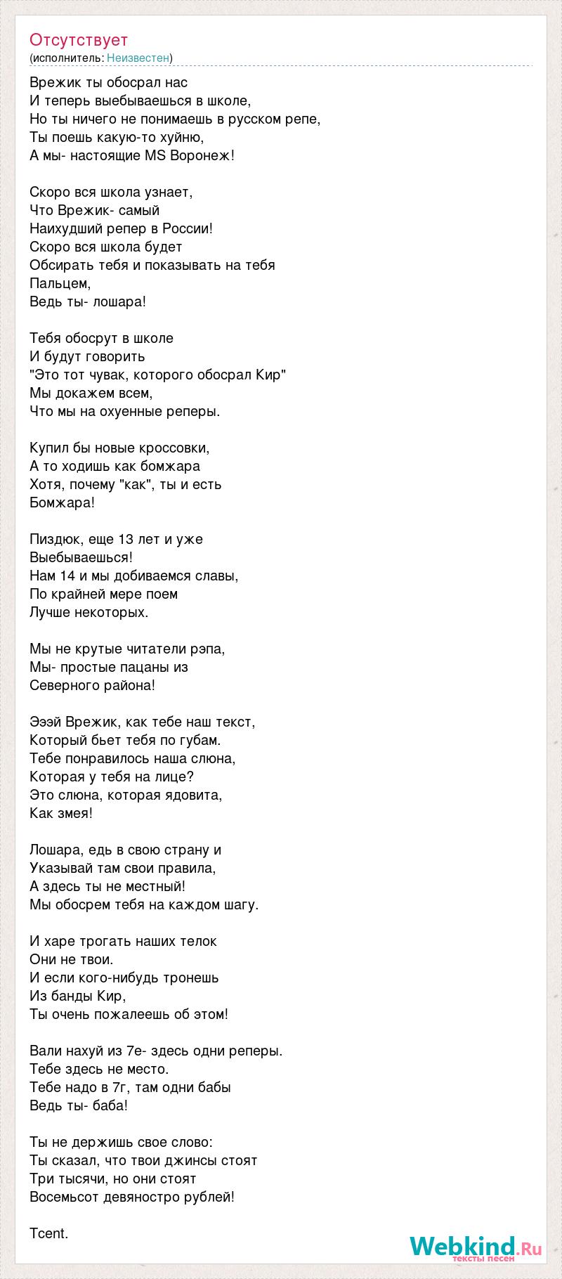 Врежик ты обосрал нас И теперь выебываешься в школе, Но ты ничего не понимаешь в русском репе, Ты поешь какую-то хуйню, А мы- настоящие MS Воронеж! Скоро вся школа узнает, Что Врежик- самый Наихудший репер в России! Скоро вся школа будет Обсирать тебя и показывать на тебя Пальцем, Ведь ты- лошара! Тебя обосрут в школе И будут говорить "Это тот чувак, которого обосрал Кир" Мы докажем всем, Что мы на охуенные реперы. Купил бы новые кроссовки, А то ходишь как бомжара Хотя, почему "как", ты и есть Бомжара! Пиздюк, еще 13 лет и уже Выебываешься! Нам 14 и мы добиваемся славы, По крайней мере поем Лучше некоторых. Мы не крутые читатели рэпа, Мы- простые пацаны из Северного района! Эээй Врежик, как тебе наш текст, Который бьет тебя по губам. Тебе понравилось наша слюна, Которая у тебя на лице? Это слюна, которая ядовита, Как змея! Лошара, едь в свою страну и Указывай там свои правила, А здесь ты не местный! Мы обосрем тебя на каждом шагу. И харе трогать наших телок Они не твои. И если кого-нибудь тронешь Из банды Кир, Ты очень пожалеешь об этом! Вали нахуй из 7е- здесь одни реперы. Тебе здесь не место. Тебе надо в 7г, там одни бабы Ведь ты- баба! Ты не держишь свое слово: Ты сказал, что твои джинсы стоят Три тысячи, но они стоят Восемьсот девяностро рублей! Tcent.