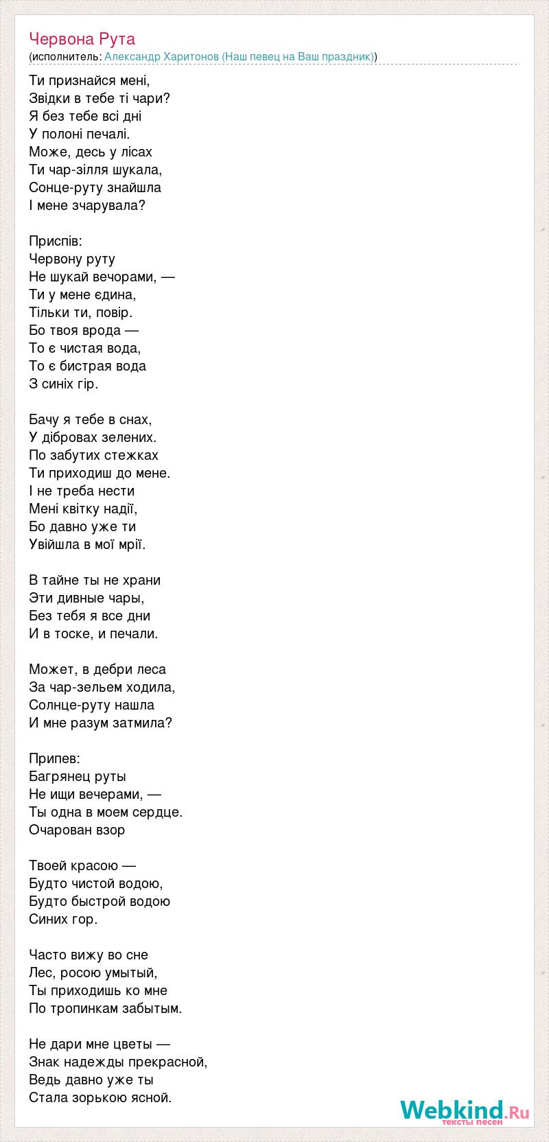 Ти признайся мені, Звідки в тебе ті чари? Я без тебе всі дні У полоні печалі. Може, десь у лісах Ти чар-зілля шукала, Сонце-руту знайшла І мене зчарувала? Приспів: Червону руту Не шукай вечорами, — Ти у мене єдина, Тільки ти, повір. Бо твоя врода — То є чистая вода, То є бистрая вода З синіх гір. Бачу я тебе в снах, У дібровах зелених. По забутих стежках Ти приходиш до мене. І не треба нести Мені квітку надії, Бо давно уже ти Увійшла в мої мрії. В тайне ты не храни Эти дивные чары, Без тебя я все дни И в тоске, и печали. Может, в дебри леса За чар-зельем ходила, Солнце-руту нашла И мне разум затмила? Припев: Багрянец руты Не ищи вечерами, — Ты одна в моем сердце. Очарован взор Твоей красою — Будто чистой водою, Будто быстрой водою Синих гор. Часто вижу во сне Лес, росою умытый, Ты приходишь ко мне По тропинкам забытым. Не дари мне цветы — Знак надежды прекрасной, Ведь давно уже ты Стала зорькою ясной.
