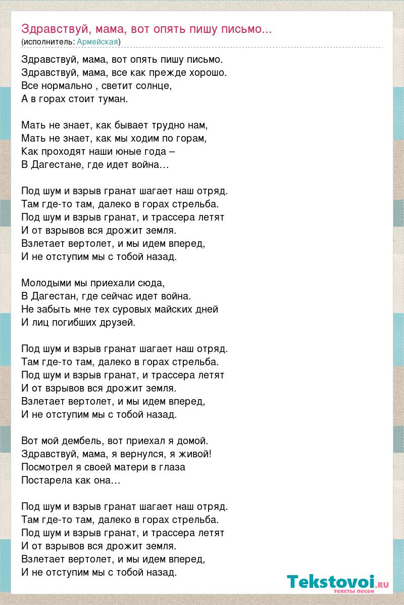 Здравствуй, мама, вот опять пишу письмо. Здравствуй, мама, все как прежде хорошо. Все нормально , светит солнце, А в горах стоит туман. Мать не знает, как бывает трудно нам, Мать не знает, как мы ходим по горам, Как проходят наши юные года – В Дагестане, где идет война… Под шум и взрыв гранат шагает наш отряд. Там где-то там, далеко в горах стрельба. Под шум и взрыв гранат, и трассера летят И от взрывов вся дрожит земля. Взлетает вертолет, и мы идем вперед, И не отступим мы с тобой назад. Молодыми мы приехали сюда, В Дагестан, где сейчас идет война. Не забыть мне тех суровых майских дней И лиц погибших друзей. Под шум и взрыв гранат шагает наш отряд. Там где-то там, далеко в горах стрельба. Под шум и взрыв гранат, и трассера летят И от взрывов вся дрожит земля. Взлетает вертолет, и мы идем вперед, И не отступим мы с тобой назад. Вот мой дембель, вот приехал я домой. Здравствуй, мама, я вернулся, я живой! Посмотрел я своей матери в глаза Постарела как она… Под шум и взрыв гранат шагает наш отряд. Там где-то там, далеко в горах стрельба. Под шум и взрыв гранат, и трассера летят И от взрывов вся дрожит земля. Взлетает вертолет, и мы идем вперед, И не отступим мы с тобой назад.