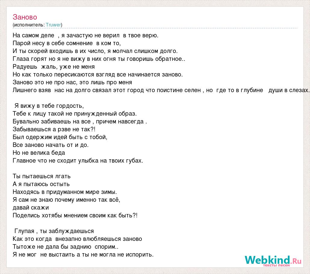 На самом деле , я зачастую не верил в твое верю. Парой несу в себе сомнение в ком то, И ты скорей входишь в их число, я молчал слишком долго. Глаза горят но я не вижу в них огня ты говоришь обратное.. Радуешь жаль, уже не меня Но как только пересикаются взгляд все начинается заново. Заново это не про нас, это лишь про меня Лишнего взяв нас на долго связал этот город что поистине селен , но где то в глубине души в слезах. Я вижу в тебе гордость, Тебе к лицу такой не принужденный образ. Бувально забиваешь на все , причем навсегда . Забываешься а рзве не так?! Был одержим идей быть с тобой, Все заново начать от и до. Но не велика беда Главное что не сходит улыбка на твоих губах. Ты пытаешься лгать А я пытаюсь остыть Находясь в придуманном мире зимы. Я сам не знаю почему именно так всё, давай скажи Поделись хотябы мнением своим как быть?! Глупая , ты заблуждаешься Как это когда внезапно влюбляешься заново Тытоже не дала бы заднию спорим.. Я не мог не выстаить а ты не могла не испорить.