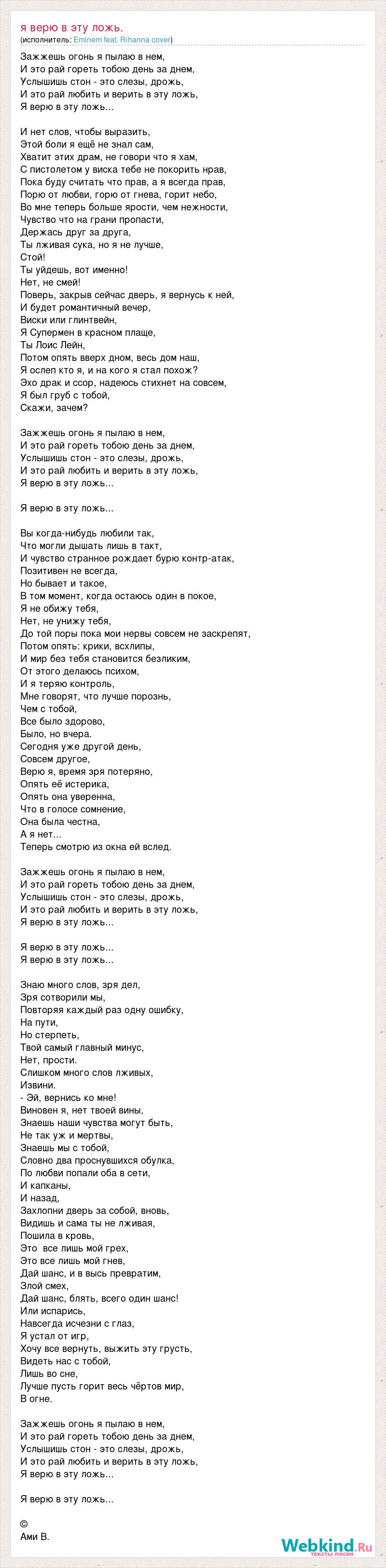 Зажжешь огонь я пылаю в нем, И это рай гореть тобою день за днем, Услышишь стон - это слезы, дрожь, И это рай любить и верить в эту ложь, Я верю в эту ложь... И нет слов, чтобы выразить, Этой боли я ещё не знал сам, Хватит этих драм, не говори что я хам, С пистолетом у виска тебе не покорить нрав, Пока буду считать что прав, а я всегда прав, Порю от любви, горю от гнева, горит небо, Во мне теперь больше ярости, чем нежности, Чувство что на грани пропасти, Держась друг за друга, Ты лживая сука, но я не лучше, Стой! Ты уйдешь, вот именно! Нет, не смей! Поверь, закрыв сейчас дверь, я вернусь к ней, И будет романтичный вечер, Виски или глинтвейн, Я Супермен в красном плаще, Ты Лоис Лейн, Потом опять вверх дном, весь дом наш, Я ослеп кто я, и на кого я стал похож? Эхо драк и ссор, надеюсь стихнет на совсем, Я был груб с тобой, Скажи, зачем? Зажжешь огонь я пылаю в нем, И это рай гореть тобою день за днем, Услышишь стон - это слезы, дрожь, И это рай любить и верить в эту ложь, Я верю в эту ложь... Я верю в эту ложь... Вы когда-нибудь любили так, Что могли дышать лишь в такт, И чувство странное рождает бурю контр-атак, Позитивен не всегда, Но бывает и такое, В том момент, когда остаюсь один в покое, Я не обижу тебя, Нет, не унижу тебя, До той поры пока мои нервы совсем не заскрепят, Потом опять: крики, всхлипы, И мир без тебя становится безликим, От этого делаюсь психом, И я теряю контроль, Мне говорят, что лучше порознь, Чем с тобой, Все было здорово, Было, но вчера. Сегодня уже другой день, Совсем другое, Верю я, время зря потеряно, Опять её истерика, Опять она уверенна, Что в голосе сомнение, Она была честна, А я нет... Теперь смотрю из окна ей вслед. Зажжешь огонь я пылаю в нем, И это рай гореть тобою день за днем, Услышишь стон - это слезы, дрожь, И это рай любить и верить в эту ложь, Я верю в эту ложь... Я верю в эту ложь... Я верю в эту ложь... Знаю много слов, зря дел, Зря сотворили мы, Повторяя каждый раз одну ошибку, На пути, Но стерпеть, Твой самый главный минус, Нет, прости. Слишком много слов лживых, Извини. - Эй, вернись ко мне! Виновен я, нет твоей вины, Знаешь наши чувства могут быть, Не так уж и мертвы, Знаешь мы с тобой, Словно два проснувшихся обулка, По любви попали оба в сети, И капканы, И назад, Захлопни дверь за собой, вновь, Видишь и сама ты не лживая, Пошила в кровь, Это все лишь мой грех, Это все лишь мой гнев, Дай шанс, и в высь превратим, Злой смех, Дай шанс, блять, всего один шанс! Или испарись, Навсегда исчезни с глаз, Я устал от игр, Хочу все вернуть, выжить эту грусть, Видеть нас с тобой, Лишь во сне, Лучше пусть горит весь чёртов мир, В огне. Зажжешь огонь я пылаю в нем, И это рай гореть тобою день за днем, Услышишь стон - это слезы, дрожь, И это рай любить и верить в эту ложь, Я верю в эту ложь... Я верю в эту ложь... © Ами В.