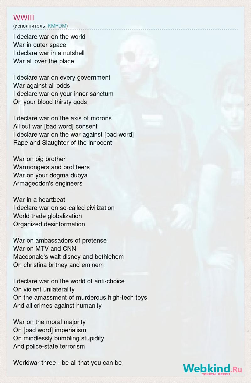 I declare war on the world War in outer space I declare war in a nutshell War all over the place I declare war on every government War against all odds I declare war on your inner sanctum On your blood thirsty gods I declare war on the axis of morons All out war [bad word] consent I declare war on the war against [bad word] Rape and Slaughter of the innocent War on big brother Warmongers and profiteers War on your dogma dubya Armageddon's engineers War in a heartbeat I declare war on so-called civilization World trade globalization Organized desinformation War on ambassadors of pretense War on MTV and CNN Macdonald's walt disney and bethlehem On christina britney and eminem I declare war on the world of anti-choice On violent unilaterality On the amassment of murderous high-tech toys And all crimes against humanity War on the moral majority On [bad word] imperialism On mindlessly bumbling stupidity And police-state terrorism Worldwar three - be all that you can be