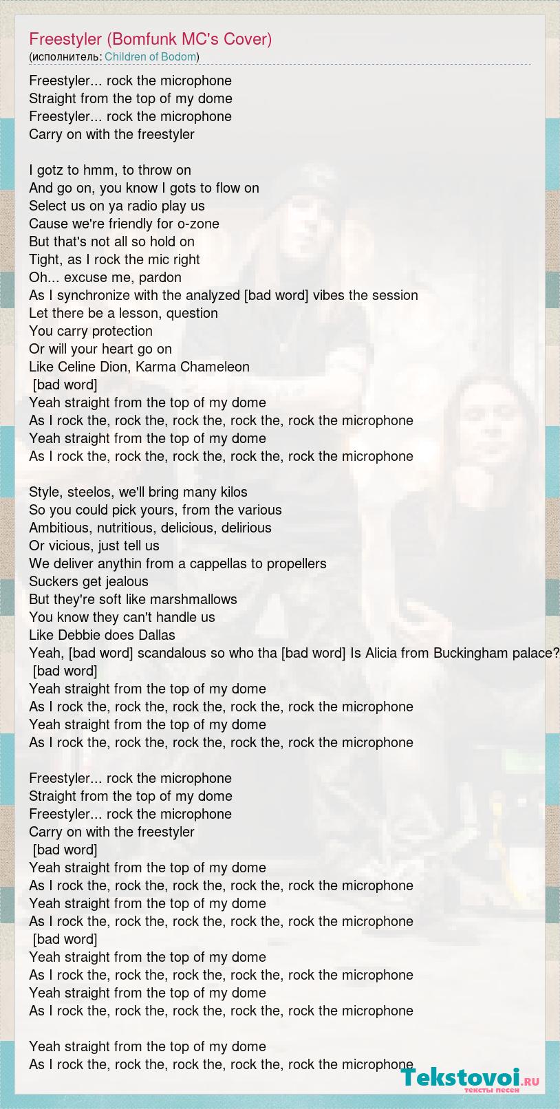 Freestyler... rock the microphone Straight from the top of my dome Freestyler... rock the microphone Carry on with the freestyler I gotz to hmm, to throw on And go on, you know I gots to flow on Select us on ya radio play us Cause we're friendly for o-zone But that's not all so hold on Tight, as I rock the mic right Oh... excuse me, pardon As I synchronize with the analyzed Upcomin vibes the session Let there be a lesson, question You carry protection Or will your heart go on Like Celine Dion, Karma Chameleon [Chorus] Yeah straight from the top of my dome As I rock the, rock the, rock the, rock the, rock the microphone Yeah straight from the top of my dome As I rock the, rock the, rock the, rock the, rock the microphone Style, steelos, we'll bring many kilos So you could pick yours, from the various Ambitious, nutritious, delicious, delirious Or vicious, just tell us We deliver anythin from a cappellas to propellers Suckers get jealous But they're soft like marshmallows You know they can't handle us Like Debbie does Dallas Yeah, we come scandalous so who tha [bad word] Is Alicia from Buckingham palace? [Chorus] Yeah straight from the top of my dome As I rock the, rock the, rock the, rock the, rock the microphone Yeah straight from the top of my dome As I rock the, rock the, rock the, rock the, rock the microphone Freestyler... rock the microphone Straight from the top of my dome Freestyler... rock the microphone Carry on with the freestyler [Chorus] Yeah straight from the top of my dome As I rock the, rock the, rock the, rock the, rock the microphone Yeah straight from the top of my dome As I rock the, rock the, rock the, rock the, rock the microphone [Chorus] Yeah straight from the top of my dome As I rock the, rock the, rock the, rock the, rock the microphone Yeah straight from the top of my dome As I rock the, rock the, rock the, rock the, rock the microphone Yeah straight from the top of my dome As I rock the, rock the, rock the, rock the, rock the microphone