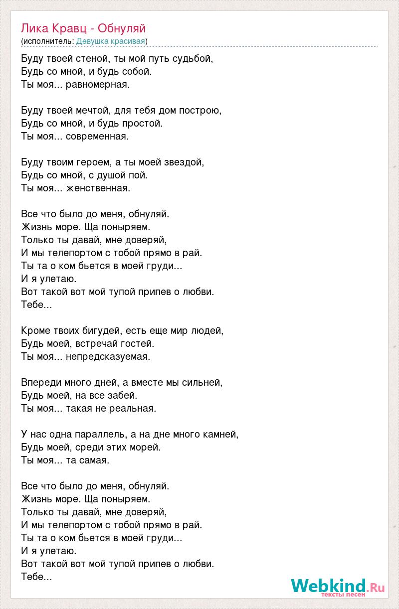 Буду твоей стеной, ты мой путь судьбой, Будь со мной, и будь собой. Ты моя... равномерная. Буду твоей мечтой, для тебя дом построю, Будь со мной, и будь простой. Ты моя... современная. Буду твоим героем, а ты моей звездой, Будь со мной, с душой пой. Ты моя... женственная. Все что было до меня, обнуляй. Жизнь море. Ща поныряем. Только ты давай, мне доверяй, И мы телепортом с тобой прямо в рай. Ты та о ком бьется в моей груди... И я улетаю. Вот такой вот мой тупой припев о любви. Тебе... Кроме твоих бигудей, есть еще мир людей, Будь моей, встречай гостей. Ты моя... непредсказуемая. Впереди много дней, а вместе мы сильней, Будь моей, на все забей. Ты моя... такая не реальная. У нас одна параллель, а на дне много камней, Будь моей, среди этих морей. Ты моя... та самая. Все что было до меня, обнуляй. Жизнь море. Ща поныряем. Только ты давай, мне доверяй, И мы телепортом с тобой прямо в рай. Ты та о ком бьется в моей груди... И я улетаю. Вот такой вот мой тупой припев о любви. Тебе...
