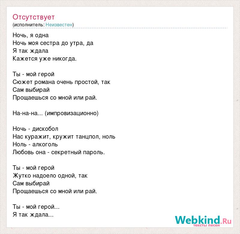 Ночь, я одна Ночь моя сестра до утра, да Я так ждала Кажется уже никогда. Ты - мой герой Сюжет романа очень простой, так Сам выбирай Прощаешься со мной или рай. На-на-на... (импровизационно) Ночь - дискобол Нас куражит, кружит танцпол, ноль Ноль - алкоголь Любовь она - секретный пароль. Ты - мой герой Жутко надоело одной, так Сам выбирай Прощаешься со мной или рай. Ты - мой герой... Я так ждала...