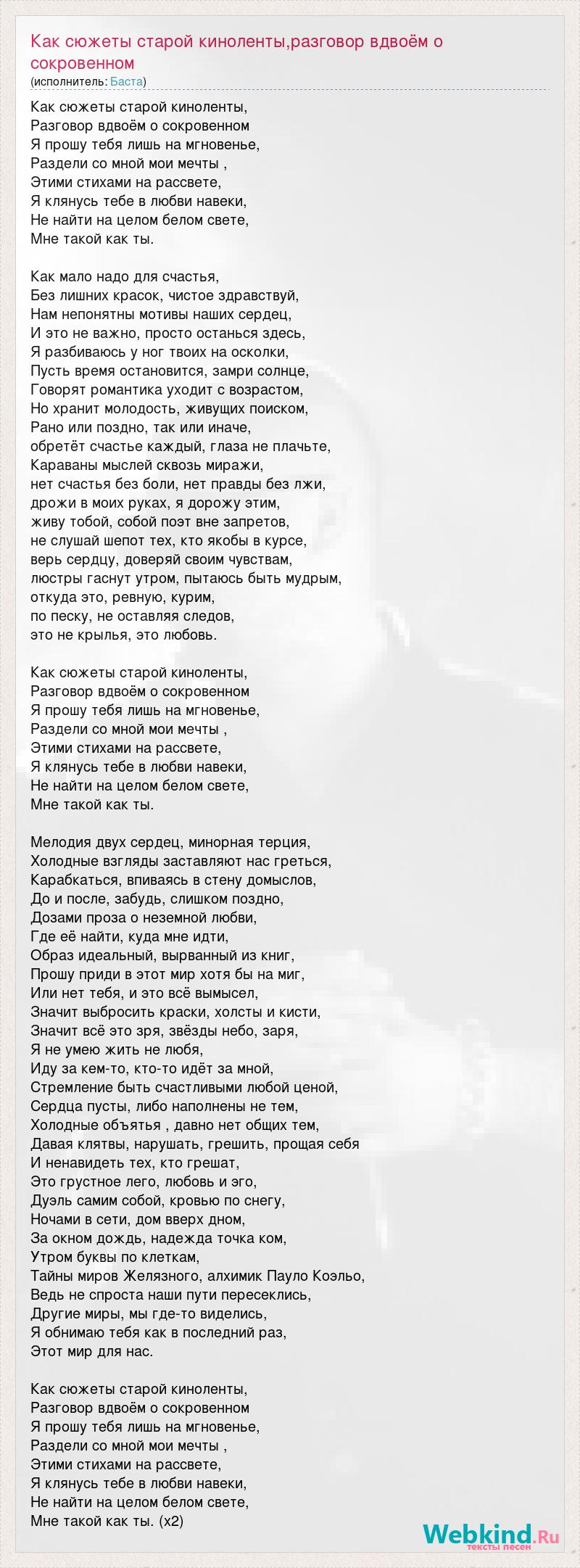 Как сюжеты старой киноленты, Разговор вдвоём о сокровенном Я прошу тебя лишь на мгновенье, Раздели со мной мои мечты , Этими стихами на рассвете, Я клянусь тебе в любви навеки, Не найти на целом белом свете, Мне такой как ты. Как мало надо для счастья, Без лишних красок, чистое здравствуй, Нам непонятны мотивы наших сердец, И это не важно, просто останься здесь, Я разбиваюсь у ног твоих на осколки, Пусть время остановится, замри солнце, Говорят романтика уходит с возрастом, Но хранит молодость, живущих поиском, Рано или поздно, так или иначе, обретёт счастье каждый, глаза не плачьте, Караваны мыслей сквозь миражи, нет счастья без боли, нет правды без лжи, дрожи в моих руках, я дорожу этим, живу тобой, собой поэт вне запретов, не слушай шепот тех, кто якобы в курсе, верь сердцу, доверяй своим чувствам, люстры гаснут утром, пытаюсь быть мудрым, откуда это, ревную, курим, по песку, не оставляя следов, это не крылья, это любовь. Как сюжеты старой киноленты, Разговор вдвоём о сокровенном Я прошу тебя лишь на мгновенье, Раздели со мной мои мечты , Этими стихами на рассвете, Я клянусь тебе в любви навеки, Не найти на целом белом свете, Мне такой как ты. Мелодия двух сердец, минорная терция, Холодные взгляды заставляют нас греться, Карабкаться, впиваясь в стену домыслов, До и после, забудь, слишком поздно, Дозами проза о неземной любви, Где её найти, куда мне идти, Образ идеальный, вырванный из книг, Прошу приди в этот мир хотя бы на миг, Или нет тебя, и это всё вымысел, Значит выбросить краски, холсты и кисти, Значит всё это зря, звёзды небо, заря, Я не умею жить не любя, Иду за кем-то, кто-то идёт за мной, Стремление быть счастливыми любой ценой, Сердца пусты, либо наполнены не тем, Холодные объятья , давно нет общих тем, Давая клятвы, нарушать, грешить, прощая себя И ненавидеть тех, кто грешат, Это грустное лего, любовь и эго, Дуэль самим собой, кровью по снегу, Ночами в сети, дом вверх дном, За окном дождь, надежда точка ком, Утром буквы по клеткам, Тайны миров Желязного, алхимик Пауло Коэльо, Ведь не спроста наши пути пересеклись, Другие миры, мы где-то виделись, Я обнимаю тебя как в последний раз, Этот мир для нас. Как сюжеты старой киноленты, Разговор вдвоём о сокровенном Я прошу тебя лишь на мгновенье, Раздели со мной мои мечты , Этими стихами на рассвете, Я клянусь тебе в любви навеки, Не найти на целом белом свете, Мне такой как ты. (х2)