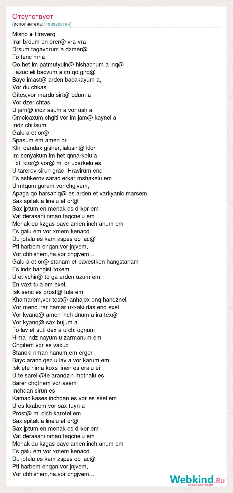 Misho ● Hraverq Irar brdum en orer@ vra-vra Drsum tagavorum a dzmer@ To tenc mna Qo het im patmutyuin@ hishacnum a inq@ Tazuc eli bacvum a im qo girq@ Bayc imast@ arden bacakayum a, Vor du chkas Gites,vor mardu sirt@ pdum a Vor dzer chtas, U jam@ indz asum a vor ush a Qmcicaxum,chgiti vor im jam@ kaynel a Indz chi lsum Galu a et or@ Spasum em amen or Klni dandax gisher,lialusin@ klor Im senyakum im het qnnarkelu a Txti ktor@,vor@ mi or uxarkelu es U tarerov sirun grac "Hravirum enq" Es ashkerov sarac erkar mshakelu em U mtqum goram vor chgjvem, Apaga qo harsaniq@ es arden et varkyanic marsem Sax spitak a linelu et or@ Sax jptum en menak es dilxor em Vat derasani nman taqcnelu em Menak du kzgas bayc amen inch anum em Es galu em vor xmem kenacd Du jptalu es kam zspes qo lac@ Pti harbem enqan,vor jnjvem, Vor chhishem,ha,vor chgjvem... Galu a et or@ stanam et pavestken hangstanam Es indz hangist toxem U et vchir@ to ga arden uzum em En vaxt tula em exel, Isk senc es prost@ tula em Khamarem,vor test@ anhajox enq handznel, Vor menq irar hamar uxxaki das enq exel Vor kyanq@ amen inch dnum a ira tex@ Vor kyanq@ sax bujum a To lav et suti dex a u chi ognum Hima indz nayum u zarmanum em Chgitem vor es vaxuc Stanoki nman hanum em erger Bayc aranc qez u lav a vor karum em Isk ete hima koxs lineir es eralu ei U te sarei @te arandzin motnalu es Barer chgtnem vor asem Inchqan sirun es Kamac kases inchqan es vor es ekel em U es kxabem vor sax tuyn a Prost@ mi qich karotel em Sax spitak a linelu et or@ Sax jptum en menak es dilxor em Vat derasani nman taqcnelu em Menak du kzgas bayc amen inch anum em Es galu em vor xmem kenacd Du jptalu es kam zspes qo lac@ Pti harbem enqan,vor jnjvem, Vor chhishem,ha,vor chgjvem...