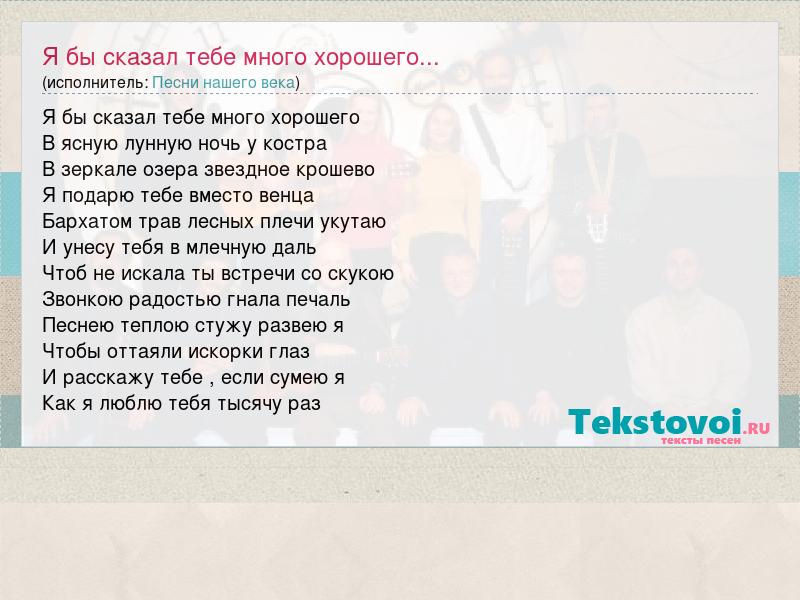 Я бы сказал тебе много хорошего В ясную лунную ночь у костра В зеркале озера звездное крошево Я подарю тебе вместо венца Бархатом трав лесных плечи укутаю И унесу тебя в млечную даль Чтоб не искала ты встречи со скукою Звонкою радостью гнала печаль Песнею теплою стужу развею я Чтобы оттаяли искорки глаз И расскажу тебе , если сумею я Как я люблю тебя тысячу раз