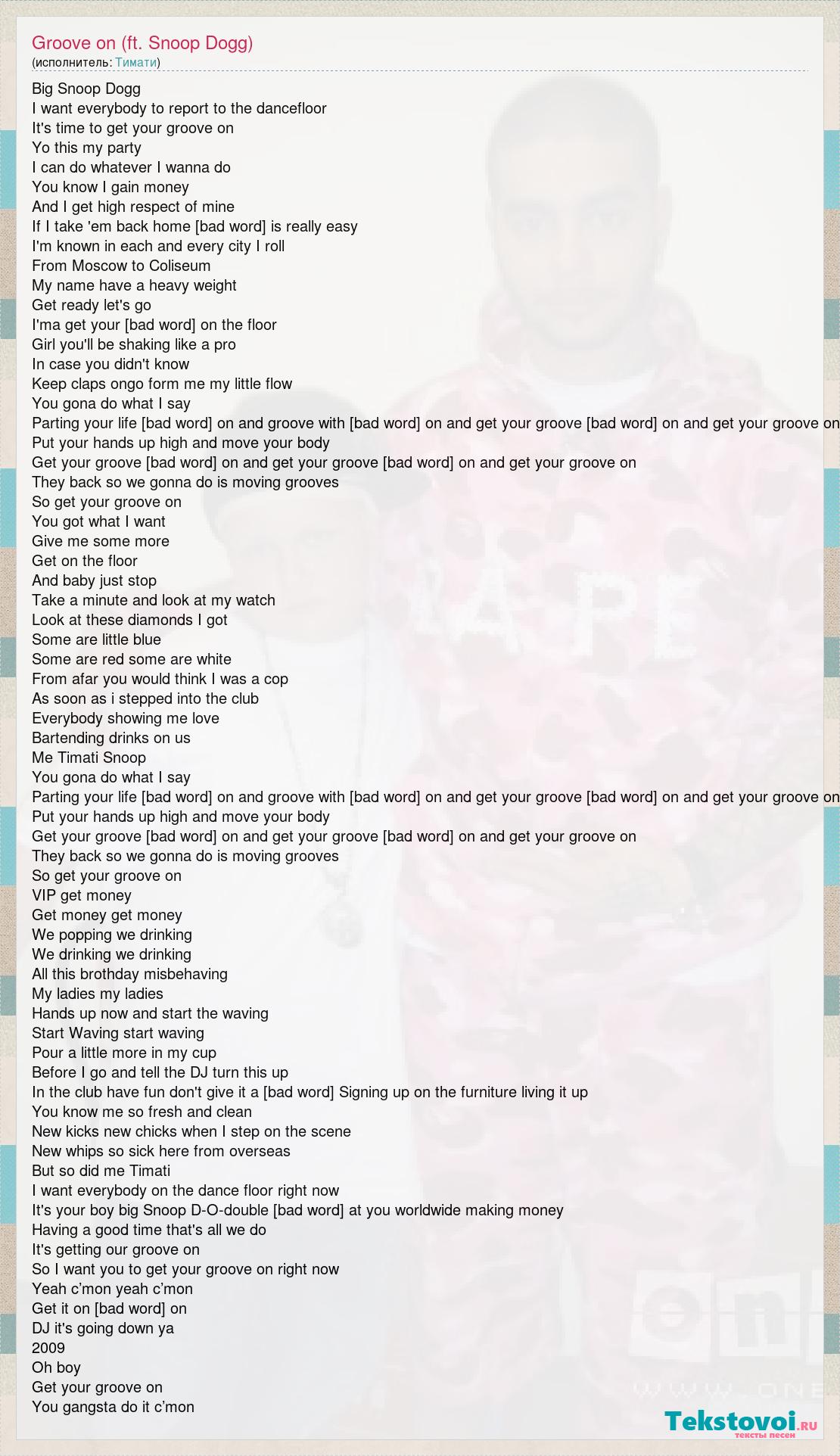 Big Snoop Dogg I want everybody to report to the dancefloor It's time to get your groove on Yo this my party I can do whatever I wanna do You know I gain money And I get high respect of mine If I take 'em back home [bad word] is really easy I'm known in each and every city I roll From Moscow to Coliseum My name have a heavy weight Get ready let's go I'ma get your [bad word] on the floor Girl you'll be shaking like a pro In case you didn't know Keep claps ongo form me my little flow You gona do what I say Parting your life [bad word] on and groove with [bad word] on and get your groove [bad word] on and get your groove on Put your hands up high and move your body Get your groove [bad word] on and get your groove [bad word] on and get your groove on They back so we gonna do is moving grooves So get your groove on You got what I want Give me some more Get on the floor And baby just stop Take a minute and look at my watch Look at these diamonds I got Some are little blue Some are red some are white From afar you would think I was a cop As soon as i stepped into the club Everybody showing me love Bartending drinks on us Me Timati Snoop You gona do what I say Parting your life [bad word] on and groove with [bad word] on and get your groove [bad word] on and get your groove on Put your hands up high and move your body Get your groove [bad word] on and get your groove [bad word] on and get your groove on They back so we gonna do is moving grooves So get your groove on VIP get money Get money get money We popping we drinking We drinking we drinking All this brothday misbehaving My ladies my ladies Hands up now and start the waving Start Waving start waving Pour a little more in my cup Before I go and tell the DJ turn this up In the club have fun don't give it a [bad word] Signing up on the furniture living it up You know me so fresh and clean New kicks new chicks when I step on the scene New whips so sick here from overseas But so did me Timati I want everybody on the dance floor right now It's your boy big Snoop D-O-double [bad word] at you worldwide making money Having a good time that's all we do It's getting our groove on So I want you to get your groove on right now Yeah c’mon yeah c’mon Get it on [bad word] on DJ it's going down ya 2009 Oh boy Get your groove on You gangsta do it c’mon