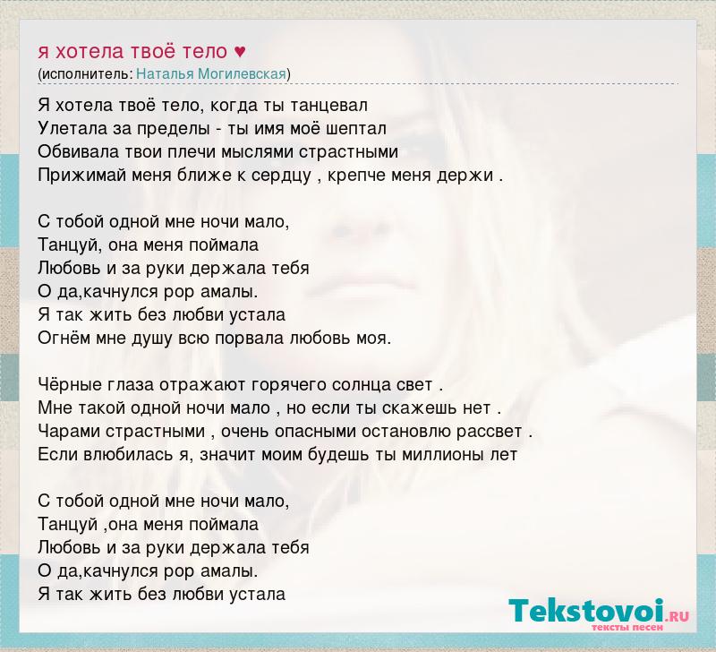 Я хотела твоё тело, когда ты танцевал Улетала за пределы - ты имя моё шептал Обвивала твои плечи мыслями страстными Прижимай меня ближе к сердцу , крепче меня держи . С тобой одной мне ночи мало, Танцуй, она меня поймала Любовь и за руки держала тебя О да,качнулся рор амалы. Я так жить без любви устала Огнём мне душу всю порвала любовь моя. Чёрные глаза отражают горячего солнца свет . Мне такой одной ночи мало , но если ты скажешь нет . Чарами страстными , очень опасными остановлю рассвет . Если влюбилась я, значит моим будешь ты миллионы лет С тобой одной мне ночи мало, Танцуй ,она меня поймала Любовь и за руки держала тебя О да,качнулся рор амалы. Я так жить без любви устала