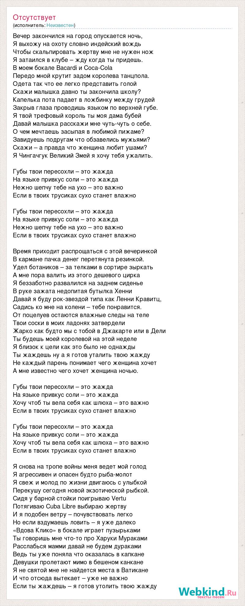 Вечер закончился на город опускается ночь, Я выхожу на охоту словно индейский вождь Чтобы скальпировать жертву мне не нужен нож Я затаился в клубе – жду когда ты придешь. В моем бокале Bacardi и Coca-Cola Передо мной крутит задом королева танцпола. Одета так что ее легко представить голой Скажи малышка давно ты закончила школу? Капелька пота падает в ложбинку между грудей Закрыв глаза проводишь языком по верхней губе. Я твой трефовый король ты моя дама бубей Давай малышка расскажи мне чуть-чуть о себе. О чем мечтаешь засыпая в любимой пижаме? Завидуешь подругам что обзавелись мужьями? Скажи – а правда что женщина любит ушами? Я Чингачгук Великий Змей я хочу тебя ужалить. Губы твои пересохли – это жажда На языке привкус соли – это жажда Нежно шепчу тебе на ухо – это важно Если в твоих трусиках сухо станет влажно Губы твои пересохли – это жажда На языке привкус соли – это жажда Нежно шепчу тебе на ухо – это важно Если в твоих трусиках сухо станет влажно Время приходит распрощаться с этой вечеринкой В кармане пачка денег перетянута резинкой. Удел ботаников – за телками в сортире зыркать А мне пора валить из этого дешевого цирка Я беззаботно развалился на заднем сиденье В руке зажата недопитая бутылка Хенни Давай я буду рок-звездой типа как Ленни Кравитц, Садись ко мне на колени – тебе понравится. От поцелуев остаются влажные следы на теле Твои соски в моих ладонях затвердели Жарко как будто мы с тобой в Джакарте или в Дели Ты будешь моей королевой на этой неделе Я близок к цели как это было не однажды Ты жаждешь ну а я готов уталить твою жажду Не каждый парень понимает чего женщина хочет А мне известно чего хочет женщина ночью. Губы твои пересохли – это жажда На языке привкус соли – это жажда Хочу чтоб ты вела себя как шлюха – это важно Если в твоих трусиках сухо станет влажно Губы твои пересохли – это жажда На языке привкус соли – это жажда Хочу чтоб ты вела себя как шлюха – это важно Если в твоих трусиках сухо станет влажно Я снова на тропе войны меня ведет мой голод Я агрессивен и опасен будто рыба-молот Я свеж и молод по жизни двигаюсь с улыбкой Перекушу сегодня новой экзотической рыбкой. Сидя у барной стойки поигрываю Vertu Потягиваю Cuba Libre выбираю жертву И я подобен ветру – почувствовать легко Но если вздумаешь ловить – я уже далеко «Вдова Клико» в бокале играет пузырьками Ты говоришь мне что-то про Харуки Мураками Расслабься мамми давай не будем дураками Ведь ты уже поняла что оказалась в капкане Девушки пролетают мимо в бешеном канкане Я не святой мне не найдется места в Ватикане И что отсюда вытекает – уже не важно Если ты жаждешь – я готов утолить твою жажду