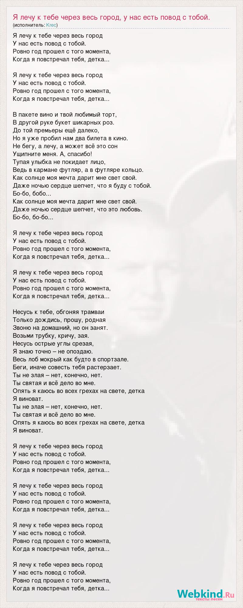 Я лечу к тебе через весь город У нас есть повод с тобой. Ровно год прошел с того момента, Когда я повстречал тебя, детка... Я лечу к тебе через весь город У нас есть повод с тобой. Ровно год прошел с того момента, Когда я повстречал тебя, детка... В пакете вино и твой любимый торт, В другой руке букет шикарных роз. До той премьеры ещё далеко, Но я уже пробил нам два билета в кино. Не бегу, а лечу, а может всё это сон Ущипните меня. А, спасибо! Тупая улыбка не покидает лицо, Ведь в кармане футляр, а в футляре кольцо. Как солнце моя мечта дарит мне свет свой. Даже ночью сердце шепчет, что я буду с тобой. Бо-бо, бобо... Как солнце моя мечта дарит мне свет свой. Даже ночью сердце шепчет, что это любовь. Бо-бо, бо-бо... Я лечу к тебе через весь город У нас есть повод с тобой. Ровно год прошел с того момента, Когда я повстречал тебя, детка... Я лечу к тебе через весь город У нас есть повод с тобой. Ровно год прошел с того момента, Когда я повстречал тебя, детка... Несусь к тебе, обгоняя трамваи Только дождись, прошу, родная Звоню на домашний, но он занят. Возьми трубку, кричу, зая. Несусь острые углы срезая, Я знаю точно – не опоздаю. Весь лоб мокрый как будто в спортзале. Беги, иначе совесть тебя растерзает. Ты не злая – нет, конечно, нет. Ты святая и всё дело во мне. Опять я каюсь во всех грехах на свете, детка Я виноват. Ты не злая – нет, конечно, нет. Ты святая и всё дело во мне. Опять я каюсь во всех грехах на свете, детка Я виноват. Я лечу к тебе через весь город У нас есть повод с тобой. Ровно год прошел с того момента, Когда я повстречал тебя, детка... Я лечу к тебе через весь город У нас есть повод с тобой. Ровно год прошел с того момента, Когда я повстречал тебя, детка... Я лечу к тебе через весь город У нас есть повод с тобой. Ровно год прошел с того момента, Когда я повстречал тебя, детка... Я лечу к тебе через весь город У нас есть повод с тобой. Ровно год прошел с того момента, Когда я повстречал тебя, детка...