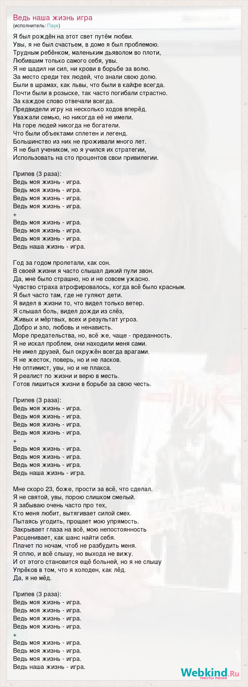 Я был рождён на этот свет путём любви. Увы, я не был счастьем, в доме я был проблемою. Трудным ребёнком, маленьким дьяволом во плоти, Любившим только самого себя, увы. Я не щадил ни сил, ни крови в борьбе за волю. За место среди тех людей, что знали свою долю. Были в шрамах, как львы, что были в кайфе всегда. Почти были в розыске, так часто погибали страстно. За каждое слово отвечали всегда. Предвидели игру на несколько ходов вперёд. Уважали семью, но никогда её не имели. На горе людей никогда не богатели. Что были объектами сплетен и легенд. Большинство из них не проживали много лет. Я не был учеником, но я учился их стратегии, Использовать на сто процентов свои привилегии. Припев (3 раза): Ведь моя жизнь - игра. Ведь моя жизнь - игра. Ведь моя жизнь - игра. Ведь моя жизнь - игра. + Ведь моя жизнь - игра. Ведь моя жизнь - игра. Ведь моя жизнь - игра. Ведь наша жизнь - игра. Год за годом пролетали, как сон. В своей жизни я часто слышал дикий пули звон. Да, мне было страшно, но и не совсем ужасно. Чувство страха атрофировалось, когда всё было красным. Я был часто там, где не гуляют дети. Я видел в жизни то, что видел только ветер. Я слышал боль, видел дожди из слёз, Живых и мёртвых, всех и результат угроз. Добро и зло, любовь и ненависть. Море предательства, но, всё же, чаще - преданность. Я не искал проблем, они находили меня сами. Не имел друзей, был окружён всегда врагами. Я не жесток, поверь, но и не ласков. Не оптимист, увы, но и не плакса. Я реалист по жизни и верю в месть. Готов лишиться жизни в борьбе за свою честь. Припев (3 раза): Ведь моя жизнь - игра. Ведь моя жизнь - игра. Ведь моя жизнь - игра. Ведь моя жизнь - игра. + Ведь моя жизнь - игра. Ведь моя жизнь - игра. Ведь моя жизнь - игра. Ведь наша жизнь - игра. Мне скоро 23, боже, прости за всё, что сделал. Я не святой, увы, порою слишком смелый. Я забываю очень часто про тех, Кто меня любит, вытягивает силой смех. Пытаясь угодить, прощает мою упрямость. Закрывает глаза на всё, мою непостоянность Расценивает, как шанс найти себя. Плачет по ночам, чтоб не разбудить меня. Я сплю, и всё слышу, но выхода не вижу. И от этого становится ещё больней, но я не слышу Упрёков в том, что я холоден, как лёд. Да, я не мёд. Припев (3 раза): Ведь моя жизнь - игра. Ведь моя жизнь - игра. Ведь моя жизнь - игра. Ведь моя жизнь - игра. + Ведь моя жизнь - игра. Ведь моя жизнь - игра. Ведь моя жизнь - игра. Ведь наша жизнь - игра.