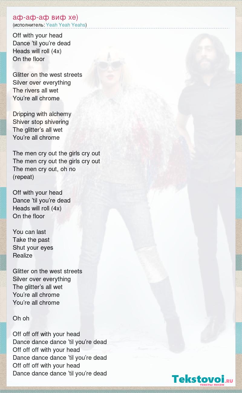 Off with your head Dance ’til you’re dead Heads will roll (4x) On the floor Glitter on the west streets Silver over everything The rivers all wet You’re all chrome Dripping with alchemy Shiver stop shivering The glitter’s all wet You’re all chrome The men cry out the girls cry out The men cry out the girls cry out The men cry out, oh no (repeat) Off with your head Dance ’til you’re dead Heads will roll (4x) On the floor You can last Take the past Shut your eyes Realize Glitter on the west streets Silver over everything The glitter’s all wet You’re all chrome You’re all chrome Oh oh Off off off with your head Dance dance dance ’til you’re dead Off off off with your head Dance dance dance ’til you’re dead Off off off with your head Dance dance dance ’til you’re dead