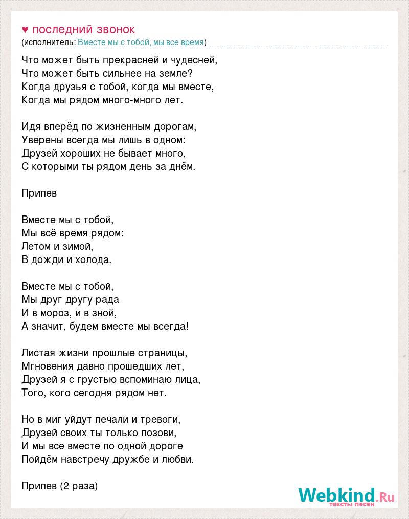 Что может быть прекрасней и чудесней, Что может быть сильнее на земле? Когда друзья с тобой, когда мы вместе, Когда мы рядом много-много лет. Идя вперёд по жизненным дорогам, Уверены всегда мы лишь в одном: Друзей хороших не бывает много, С которыми ты рядом день за днём. Припев Вместе мы с тобой, Мы всё время рядом: Летом и зимой, В дожди и холода. Вместе мы с тобой, Мы друг другу рада И в мороз, и в зной, А значит, будем вместе мы всегда! Листая жизни прошлые страницы, Мгновения давно прошедших лет, Друзей я с грустью вспоминаю лица, Того, кого сегодня рядом нет. Но в миг уйдут печали и тревоги, Друзей своих ты только позови, И мы все вместе по одной дороге Пойдём навстречу дружбе и любви. Припев (2 раза)