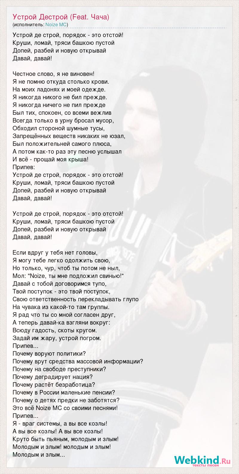 Устрой де строй, порядок - это отстой! Круши, ломай, тряси башкою пустой Допей, разбей и новую открывай Давай, давай! Честное слово, я не виновен! Я не помню откуда столько крови. На моих ладонях и моей одежде. Я никогда никого не бил прежде. Я никогда ничего не пил прежде Был тих, спокоен, со всеми вежлив Всегда только в урну бросал мусор, Обходил стороной шумные тусы, Запрещённых веществ никаких не юзал, Был положительней самого плюса, А потом как-то раз эту песню услышал И всё - прощай моя крыша! Припев: Устрой де строй, порядок - это отстой! Круши, ломай, тряси башкою пустой Допей, разбей и новую открывай Давай, давай! Устрой де строй, порядок - это отстой! Круши, ломай, тряси башкою пустой Допей, разбей и новую открывай Давай, давай! Если вдруг у тебя нет головы, Я могу тебе легко одолжить свою, Но только, чур, чтоб ты потом не ныл, Мол: "Noize, ты мне подложил свинью!" Давай с тобой договоримся тупо, Твой поступок - это твой поступок, Свою ответственность перекладывать глупо На чувака из какой-то там группы. Я рад что ты со мной согласен друг, А теперь давай-ка взгляни вокруг: Всюду гадость, скоты кругом. Задай им жару, устрой погром. Припев... Почему воруют политики? Почему врут средства массовой информации? Почему на свободе преступники? Почему деградирует нация? Почему растёт безработица? Почему в России маленькие пенсии? Почему о детях предки не заботятся? Это всё Noize MC со своими песнями! Припев... Я - враг системы, а вы все козлы! А вы все козлы! А вы все козлы! Круто быть пьяным, молодым и злым! Молодым и злым! молодым и злым! Молодым и злым...