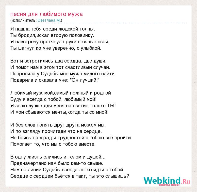 Я нашла тебя среди людской толпы. Ты бродил,искал вторую половинку. Я навстречу протянула руки нежные свои, Ты шагнул ко мне уверенно, с улыбкой. Вот и встретились два сердца, две души. И помог нам в этом тот счастливый случай. Попросила у Судьбы мне мужа милого найти. Подарила и сказала мне: "Он лучший!" Любимый муж мой,самый нежный и родной Буду я всегда с тобой, любимый мой! Я знаю лучше для меня на светие только ТЫ! И мои сбываются мечты,когда ты со мной! И без слов понять друг друга можем мы, И по взгляду прочитаем что на сердце. Не боясь преград и трудностей с тобою всё пройти Помогает то, что мы с тобою вместе. В одну жизнь слились и телом и душой... Предначертано нам было кем-то свыше. Нам по линии Судьбы всегда легко идти с тобой Сердце с сердцем бьётся в такт, ты это слышишь?