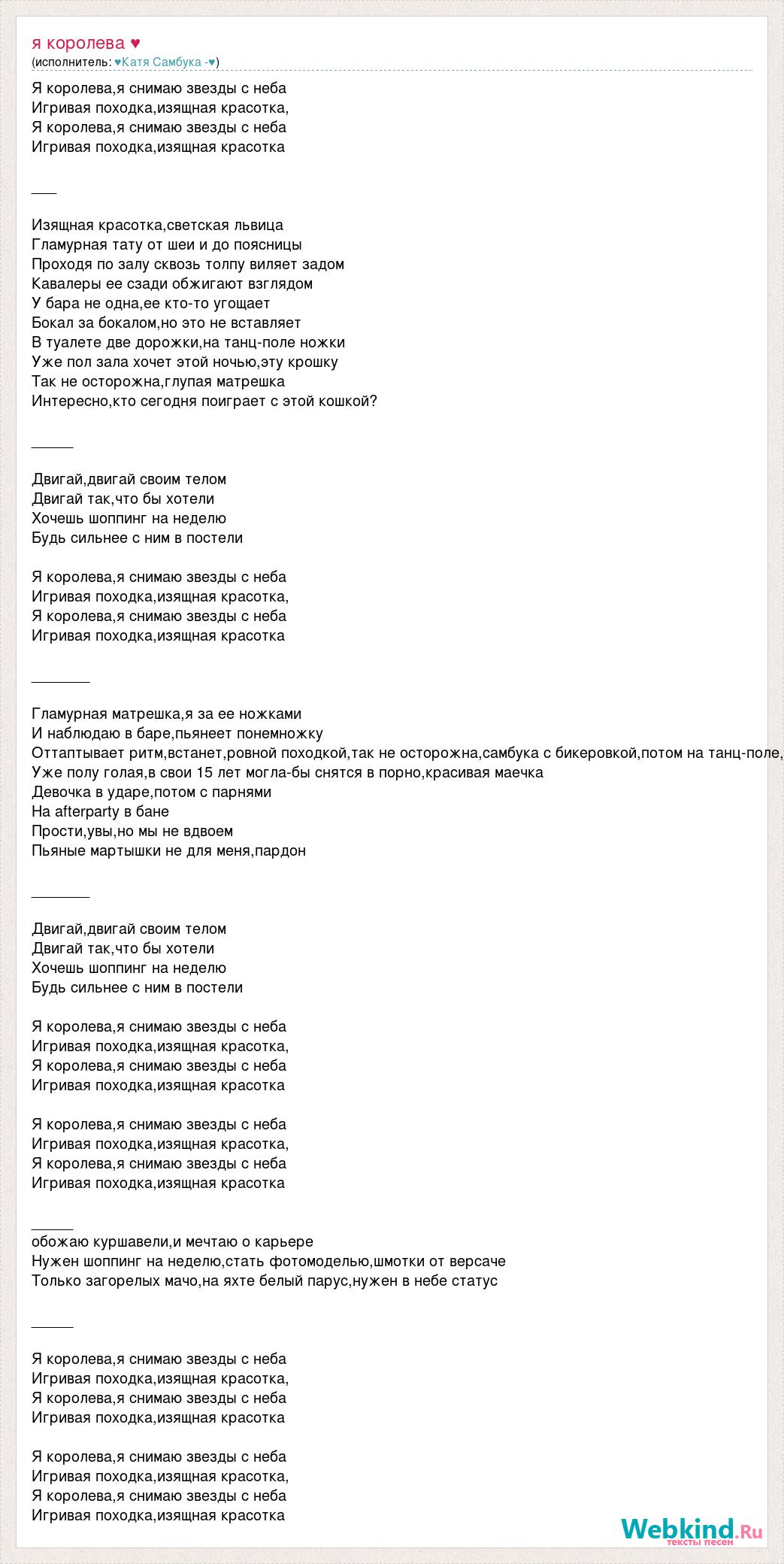 Я королева,я снимаю звезды с неба Игривая походка,изящная красотка, Я королева,я снимаю звезды с неба Игривая походка,изящная красотка ___ Изящная красотка,светская львица Гламурная тату от шеи и до поясницы Проходя по залу сквозь толпу виляет задом Кавалеры ее сзади обжигают взглядом У бара не одна,ее кто-то угощает Бокал за бокалом,но это не вставляет В туалете две дорожки,на танц-поле ножки Уже пол зала хочет этой ночью,эту крошку Так не осторожна,глупая матрешка Интересно,кто сегодня поиграет с этой кошкой? _____ Двигай,двигай своим телом Двигай так,что бы хотели Хочешь шоппинг на неделю Будь сильнее с ним в постели Я королева,я снимаю звезды с неба Игривая походка,изящная красотка, Я королева,я снимаю звезды с неба Игривая походка,изящная красотка _______ Гламурная матрешка,я за ее ножками И наблюдаю в баре,пьянеет понемножку Оттаптывает ритм,встанет,ровной походкой,так не осторожна,самбука с бикеровкой,потом на танц-поле, Уже полу голая,в свои 15 лет могла-бы снятся в порно,красивая маечка Девочка в ударе,потом с парнями На afterparty в бане Прости,увы,но мы не вдвоем Пьяные мартышки не для меня,пардон _______ Двигай,двигай своим телом Двигай так,что бы хотели Хочешь шоппинг на неделю Будь сильнее с ним в постели Я королева,я снимаю звезды с неба Игривая походка,изящная красотка, Я королева,я снимаю звезды с неба Игривая походка,изящная красотка Я королева,я снимаю звезды с неба Игривая походка,изящная красотка, Я королева,я снимаю звезды с неба Игривая походка,изящная красотка _____ обожаю куршавели,и мечтаю о карьере Нужен шоппинг на неделю,стать фотомоделью,шмотки от версаче Только загорелых мачо,на яхте белый парус,нужен в небе статус _____ Я королева,я снимаю звезды с неба Игривая походка,изящная красотка, Я королева,я снимаю звезды с неба Игривая походка,изящная красотка Я королева,я снимаю звезды с неба Игривая походка,изящная красотка, Я королева,я снимаю звезды с неба Игривая походка,изящная красотка