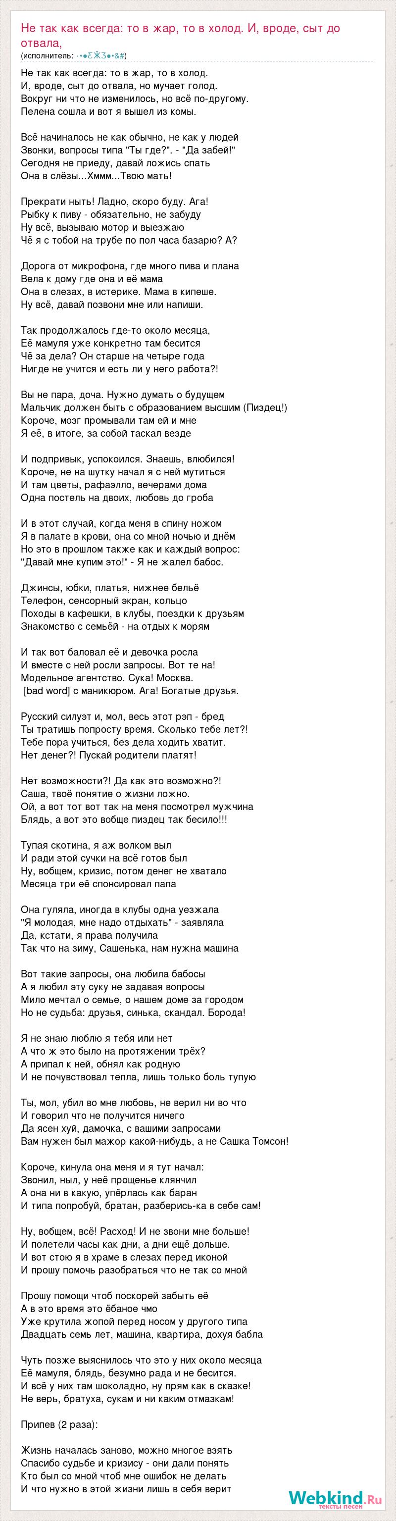 Не так как всегда: то в жар, то в холод. И, вроде, сыт до отвала, но мучает голод. Вокруг ни что не изменилось, но всё по-другому. Пелена сошла и вот я вышел из комы. Всё начиналось не как обычно, не как у людей Звонки, вопросы типа "Ты где?". - "Да забей!" Сегодня не приеду, давай ложись спать Она в слёзы...Хммм...Твою мать! Прекрати ныть! Ладно, скоро буду. Ага! Рыбку к пиву - обязательно, не забуду Ну всё, вызываю мотор и выезжаю Чё я с тобой на трубе по пол часа базарю? А? Дорога от микрофона, где много пива и плана Вела к дому где она и её мама Она в слезах, в истерике. Мама в кипеше. Ну всё, давай позвони мне или напиши. Так продолжалось где-то около месяца, Её мамуля уже конкретно там бесится Чё за дела? Он старше на четыре года Нигде не учится и есть ли у него работа?! Вы не пара, доча. Нужно думать о будущем Мальчик должен быть с образованием высшим (Пиздец!) Короче, мозг промывали там ей и мне Я её, в итоге, за собой таскал везде И подпривык, успокоился. Знаешь, влюбился! Короче, не на шутку начал я с ней мутиться И там цветы, рафаэлло, вечерами дома Одна постель на двоих, любовь до гроба И в этот случай, когда меня в спину ножом Я в палате в крови, она со мной ночью и днём Но это в прошлом также как и каждый вопрос: "Давай мне купим это!" - Я не жалел бабос. Джинсы, юбки, платья, нижнее бельё Телефон, сенсорный экран, кольцо Походы в кафешки, в клубы, поездки к друзьям Знакомство с семьёй - на отдых к морям И так вот баловал её и девочка росла И вместе с ней росли запросы. Вот те на! Модельное агентство. Сука! Москва. [bad word] с маникюром. Ага! Богатые друзья. Русский силуэт и, мол, весь этот рэп - бред Ты тратишь попросту время. Сколько тебе лет?! Тебе пора учиться, без дела ходить хватит. Нет денег?! Пускай родители платят! Нет возможности?! Да как это возможно?! Саша, твоё понятие о жизни ложно. Ой, а вот тот вот так на меня посмотрел мужчина Блядь, а вот это вобще пиздец так бесило!!! Тупая скотина, я аж волком выл И ради этой сучки на всё готов был Ну, вобщем, кризис, потом денег не хватало Месяца три её спонсировал папа Она гуляла, иногда в клубы одна уезжала "Я молодая, мне надо отдыхать" - заявляла Да, кстати, я права получила Так что на зиму, Сашенька, нам нужна машина Вот такие запросы, она любила бабосы А я любил эту суку не задавая вопросы Мило мечтал о семье, о нашем доме за городом Но не судьба: друзья, синька, скандал. Борода! Я не знаю люблю я тебя или нет А что ж это было на протяжении трёх? А припал к ней, обнял как родную И не почувствовал тепла, лишь только боль тупую Ты, мол, убил во мне любовь, не верил ни во что И говорил что не получится ничего Да ясен хуй, дамочка, с вашими запросами Вам нужен был мажор какой-нибудь, а не Сашка Томсон! Короче, кинула она меня и я тут начал: Звонил, ныл, у неё прощенье клянчил А она ни в какую, упёрлась как баран И типа попробуй, братан, разберись-ка в себе сам! Ну, вобщем, всё! Расход! И не звони мне больше! И полетели часы как дни, а дни ещё дольше. И вот стою я в храме в слезах перед иконой И прошу помочь разобраться что не так со мной Прошу помощи чтоб поскорей забыть её А в это время это ёбаное чмо Уже крутила жопой перед носом у другого типа Двадцать семь лет, машина, квартира, дохуя бабла Чуть позже выяснилось что это у них около месяца Её мамуля, блядь, безумно рада и не бесится. И всё у них там шоколадно, ну прям как в сказке! Не верь, братуха, сукам и ни каким отм