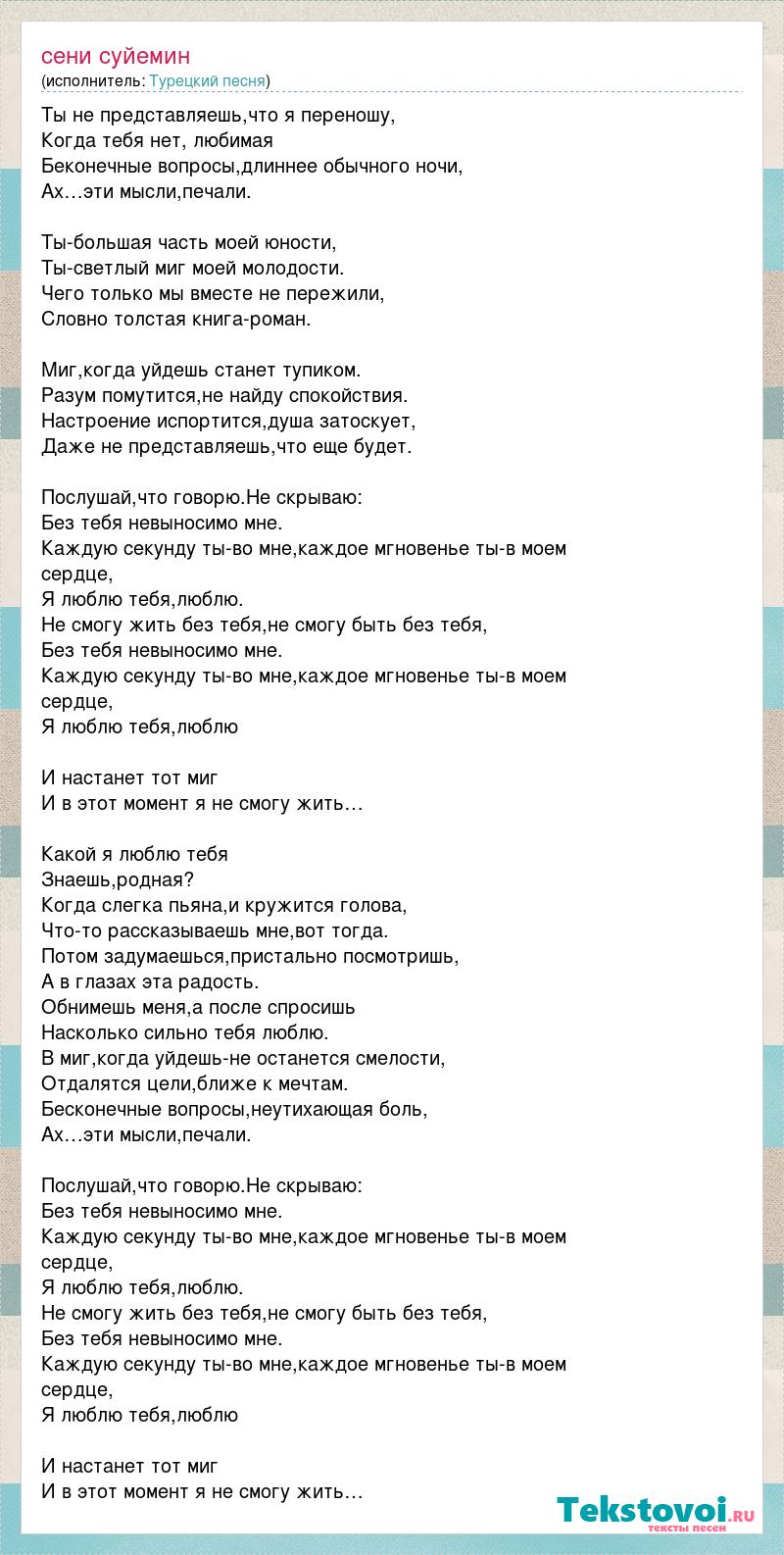 Ты не представляешь,что я переношу, Когда тебя нет, любимая Беконечные вопросы,длиннее обычного ночи, Ах…эти мысли,печали. Ты-большая часть моей юности, Ты-светлый миг моей молодости. Чего только мы вместе не пережили, Словно толстая книга-роман. Миг,когда уйдешь станет тупиком. Разум помутится,не найду спокойствия. Настроение испортится,душа затоскует, Даже не представляешь,что еще будет. Послушай,что говорю.Не скрываю: Без тебя невыносимо мне. Каждую секунду ты-во мне,каждое мгновенье ты-в моем сердце, Я люблю тебя,люблю. Не смогу жить без тебя,не смогу быть без тебя, Без тебя невыносимо мне. Каждую секунду ты-во мне,каждое мгновенье ты-в моем сердце, Я люблю тебя,люблю И настанет тот миг И в этот момент я не смогу жить… Какой я люблю тебя Знаешь,родная? Когда слегка пьяна,и кружится голова, Что-то рассказываешь мне,вот тогда. Потом задумаешься,пристально посмотришь, А в глазах эта радость. Обнимешь меня,а после спросишь Насколько сильно тебя люблю. В миг,когда уйдешь-не останется смелости, Отдалятся цели,ближе к мечтам. Бесконечные вопросы,неутихающая боль, Ах…эти мысли,печали. Послушай,что говорю.Не скрываю: Без тебя невыносимо мне. Каждую секунду ты-во мне,каждое мгновенье ты-в моем сердце, Я люблю тебя,люблю. Не смогу жить без тебя,не смогу быть без тебя, Без тебя невыносимо мне. Каждую секунду ты-во мне,каждое мгновенье ты-в моем сердце, Я люблю тебя,люблю И настанет тот миг И в этот момент я не смогу жить…
