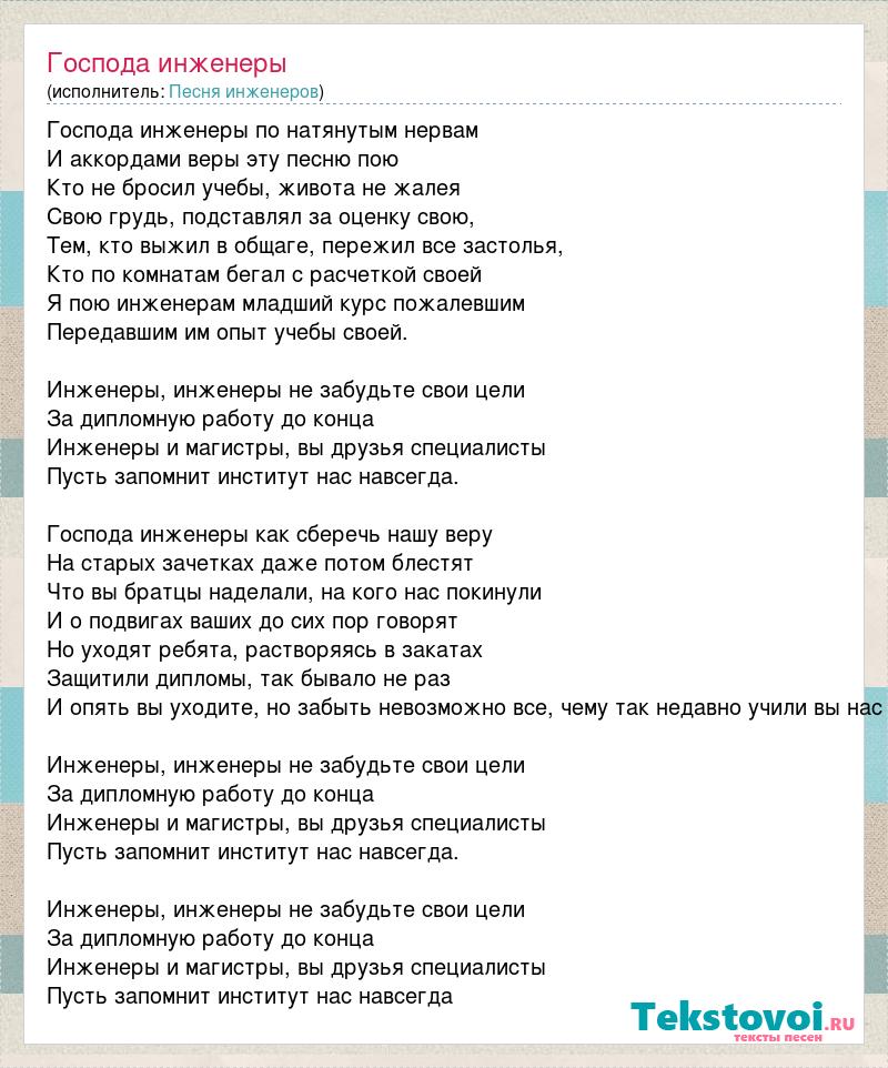 Господа инженеры по натянутым нервам И аккордами веры эту песню пою Кто не бросил учебы, живота не жалея Свою грудь, подставлял за оценку свою, Тем, кто выжил в общаге, пережил все застолья, Кто по комнатам бегал с расчеткой своей Я пою инженерам младший курс пожалевшим Передавшим им опыт учебы своей. Инженеры, инженеры не забудьте свои цели За дипломную работу до конца Инженеры и магистры, вы друзья специалисты Пусть запомнит институт нас навсегда. Господа инженеры как сберечь нашу веру На старых зачетках даже потом блестят Что вы братцы наделали, на кого нас покинули И о подвигах ваших до сих пор говорят Но уходят ребята, растворяясь в закатах Защитили дипломы, так бывало не раз И опять вы уходите, но забыть невозможно все, чему так недавно учили вы нас Инженеры, инженеры не забудьте свои цели За дипломную работу до конца Инженеры и магистры, вы друзья специалисты Пусть запомнит институт нас навсегда. Инженеры, инженеры не забудьте свои цели За дипломную работу до конца Инженеры и магистры, вы друзья специалисты Пусть запомнит институт нас навсегда