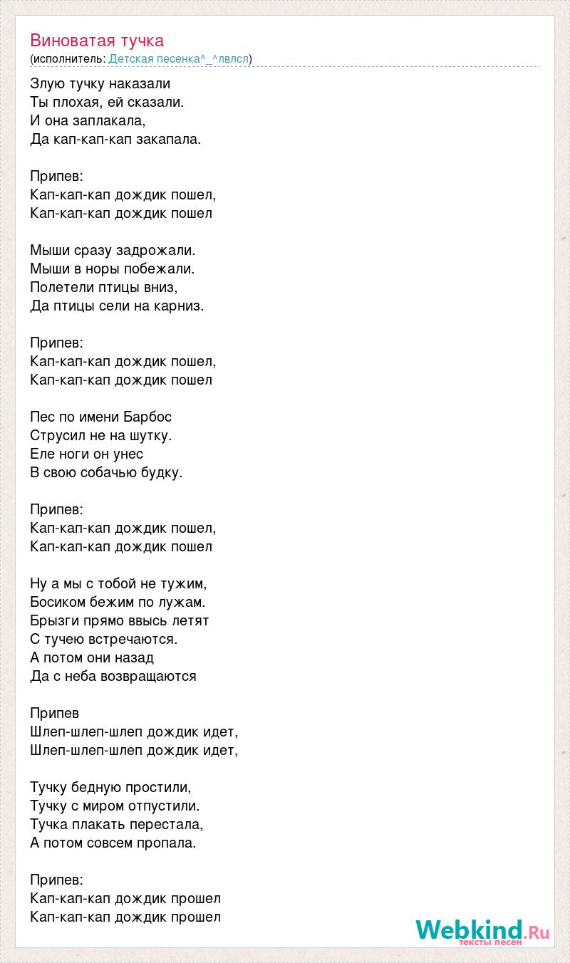 Злую тучку наказали Ты плохая, ей сказали. И она заплакала, Да кап-кап-кап закапала. Припев: Кап-кап-кап дождик пошел, Кап-кап-кап дождик пошел Мыши сразу задрожали. Мыши в норы побежали. Полетели птицы вниз, Да птицы сели на карниз. Припев: Кап-кап-кап дождик пошел, Кап-кап-кап дождик пошел Пес по имени Барбос Струсил не на шутку. Еле ноги он унес В свою собачью будку. Припев: Кап-кап-кап дождик пошел, Кап-кап-кап дождик пошел Ну а мы с тобой не тужим, Босиком бежим по лужам. Брызги прямо ввысь летят С тучею встречаются. А потом они назад Да с неба возвращаются Припев Шлеп-шлеп-шлеп дождик идет, Шлеп-шлеп-шлеп дождик идет, Тучку бедную простили, Тучку с миром отпустили. Тучка плакать перестала, А потом совсем пропала. Припев: Кап-кап-кап дождик прошел Кап-кап-кап дождик прошел