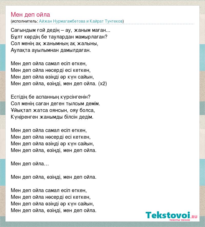 Сағындым ғой дедің – ау, жаным маған... Бұлт көрдің бе таулардан мамырлаған? Сол менің ақ жанымның ақ жалыны, Аулақта ауылымнан дамылдаған. Мен деп ойла самал есiп өткен, Мен деп ойла нөсердi есi кеткен, Мен деп ойла өзіңді әр күн сайын, Мен деп ойла, өзіңді, мен деп ойла. (х2) Естідің бе аспанның күрсінгенін? Сол менің саған деген тылсым демім. Ұйықтап жатса оянсын, ояу болса, Күңіренген жанымды білсін дедім. Мен деп ойла самал есiп өткен, Мен деп ойла нөсердi есi кеткен, Мен деп ойла өзіңді әр күн сайын, Мен деп ойла, өзіңді, мен деп ойла. Мен деп ойла… Мен деп ойла, өзіңді, мен деп ойла. Мен деп ойла самал есiп өткен, Мен деп ойла нөсердi есi кеткен, Мен деп ойла өзіңді әр күн сайын, Мен деп ойла, өзіңді, мен деп ойла.